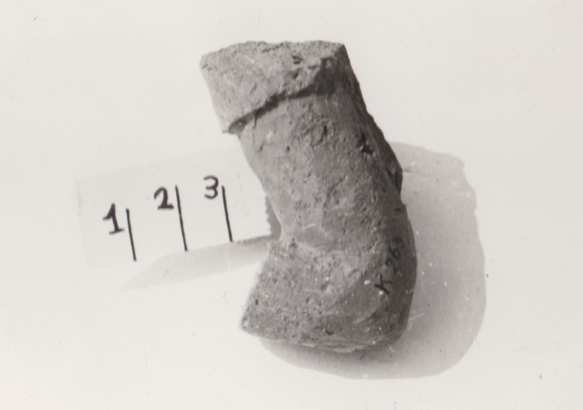 Resta il braccio sinistro con parte dell'avambraccio. La figura vestiva un abito con manica corta. Parte posteriore appiattita e non finita. Aveva quasi certamente una sola veduta, quella frontale. Argilla di colore rosa-arancio con grossi inclusi, porosa, a frattura irregolare. Eseguita a stampo