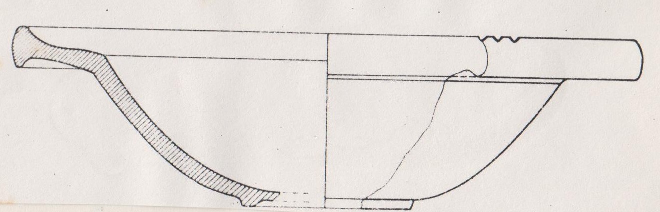 Coppa in terra sigillata chiara di tipo D, probabilmente affine al tipo classificato dal Lamboglia come forma n. 57. Ha orlo sagomato, leggermente pendente, sul cui bordo superiore esterno si intravvedono delle tacche. Lieve scanalatura esterna sotto l'orlo. Pareti spesse e piede corto. Argilla arancione, vernice arancione