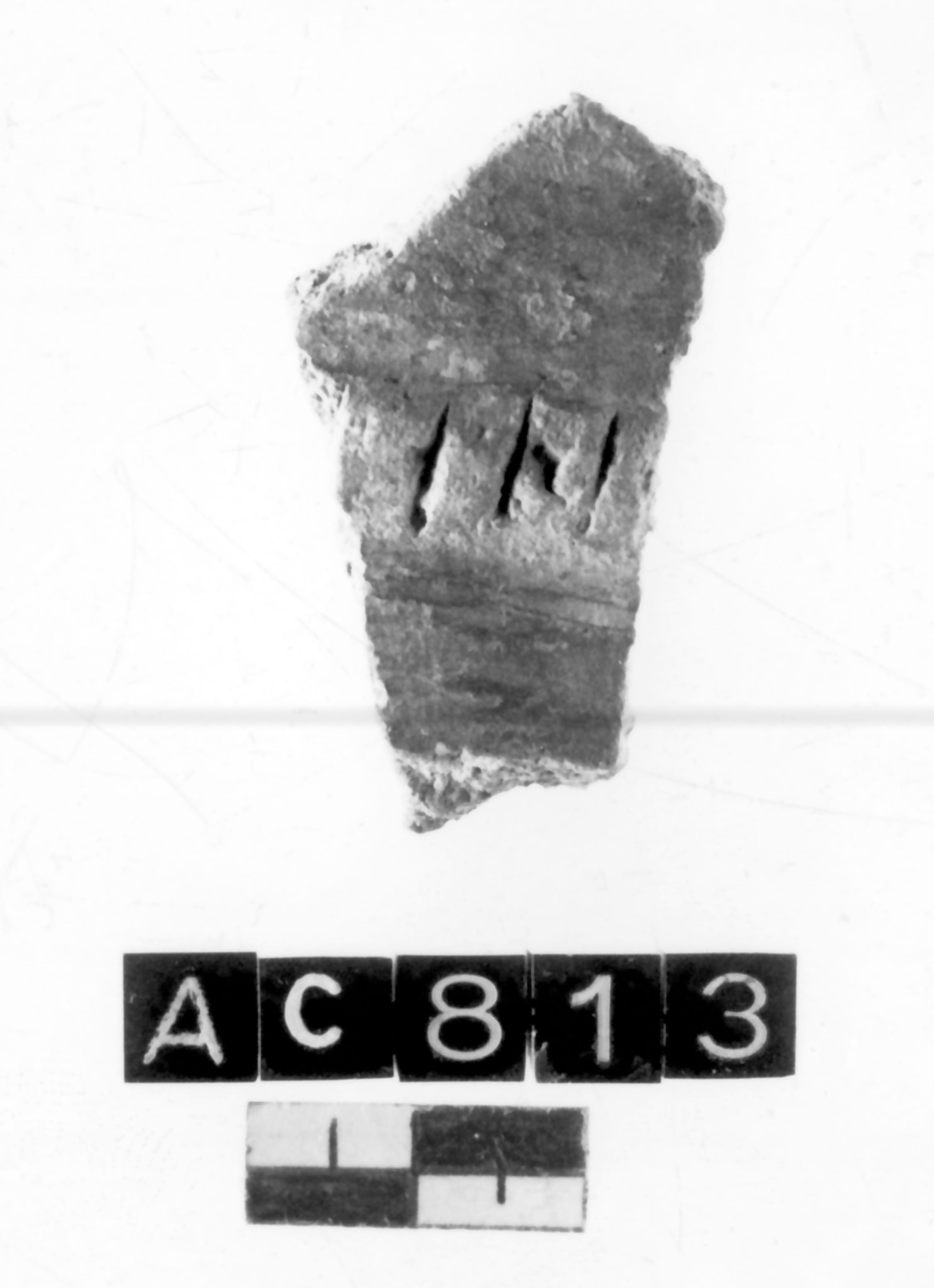 Frammento di parete di vaso, di cui non è possibile ricostruire la forma. E' presente un cordone appiattito con segmenti verticali impressi a crudo. Impasto non depurato. Superficie levigata con tracce di steccature. Colore esterno rossiccio, interno bruno scuro