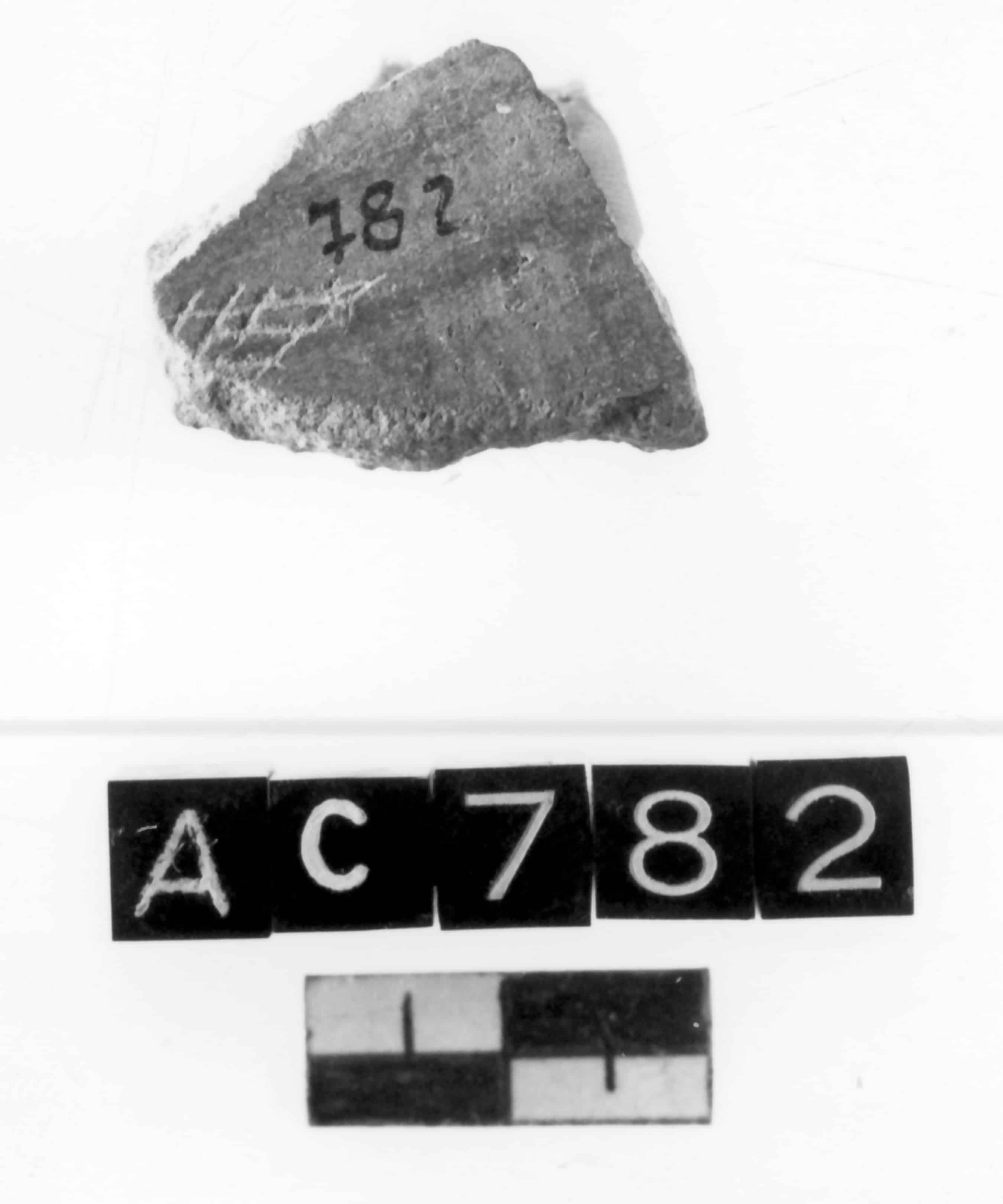 Frammento di parete di vaso, di cui non è possibile ricostruire la forma. La decorazione, graffita a secco, è formata da un triangolo, incompleto di un lato, reticolato. Impasto depurato. Superficie levigata e lucidata. Colore marrone chiaro