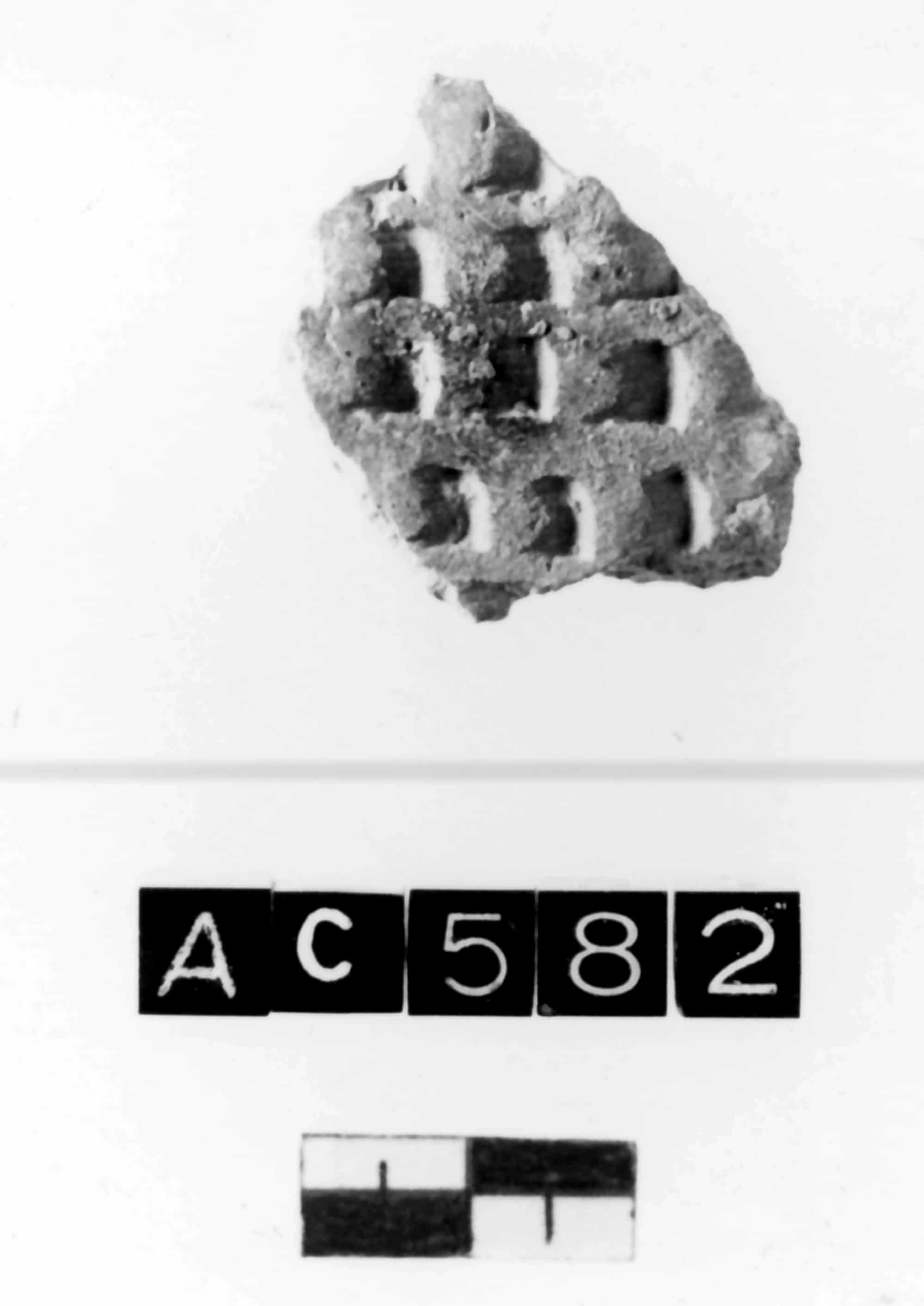 Frammento di parete di vaso, di cui non è possibile ricostruire la forma. La decorazione impressa è formata da tacche quadrangolari impresse con uno strumento a punta piana, ricavato da una canna. Impasto non depurato. Superfici levigate e lucidate. Colore rossastro con macchie nere