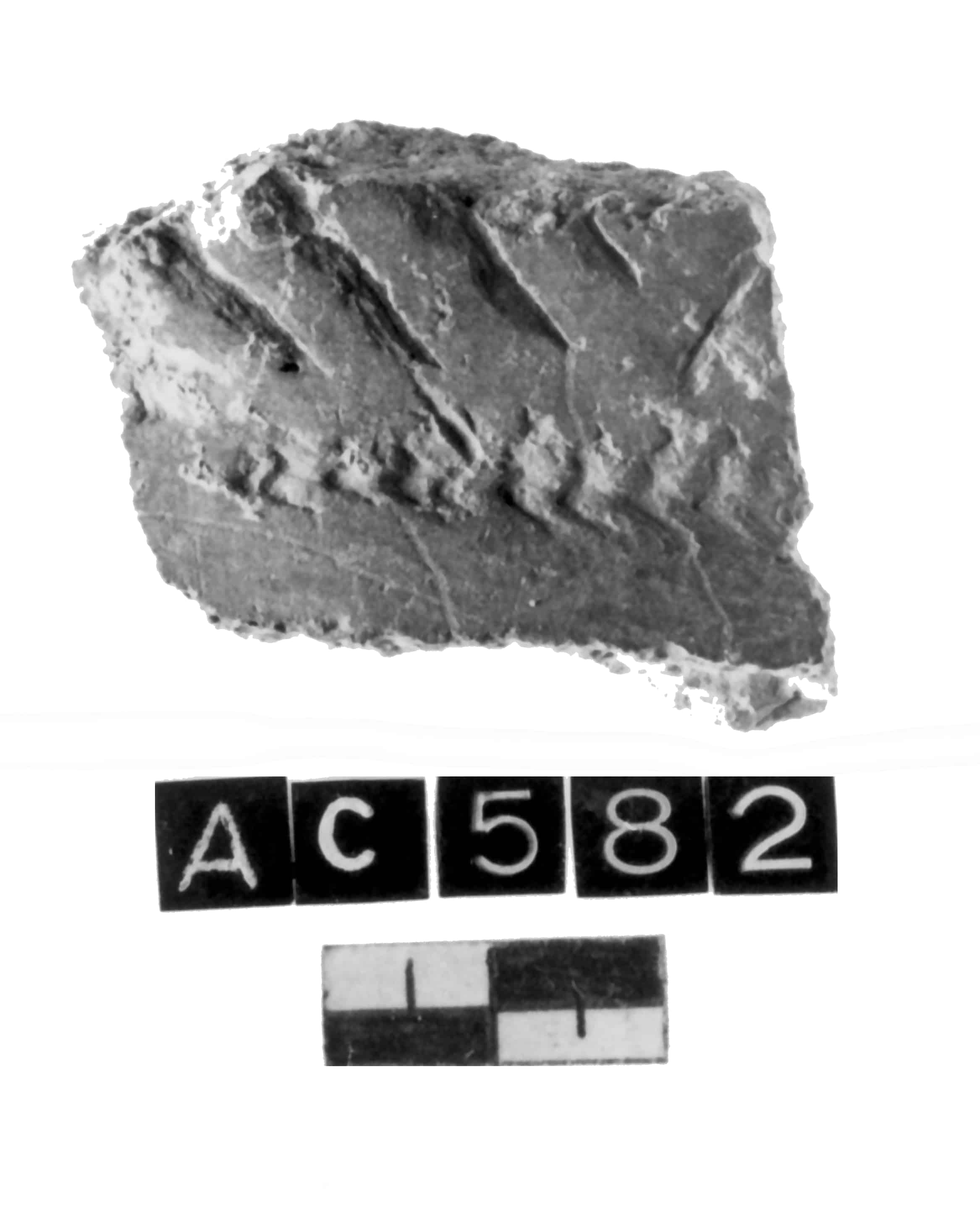 Frammento di parete di vaso, di cui non è possibile ricostruire la forma. La decorazione impressa è formata da un fascio di segmenti cardiali e da solchi obliqui. Impasto non depurato. Superfici lisciate. Colore nero