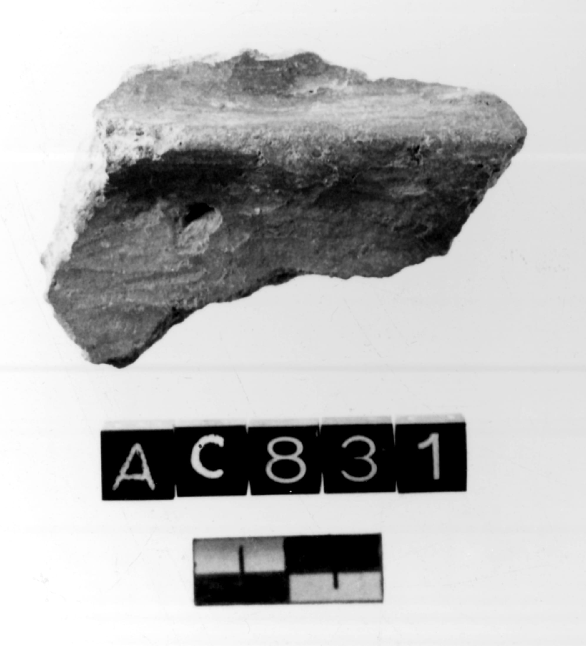 Frammento di parete di vaso, di cui non è possibile ricostruire la forma. E' presente un cordone abbastanza rilevato, a sezione triangolare. Impasto non depurato. Superfici lisciate. Colore esterno bruno, interno nero