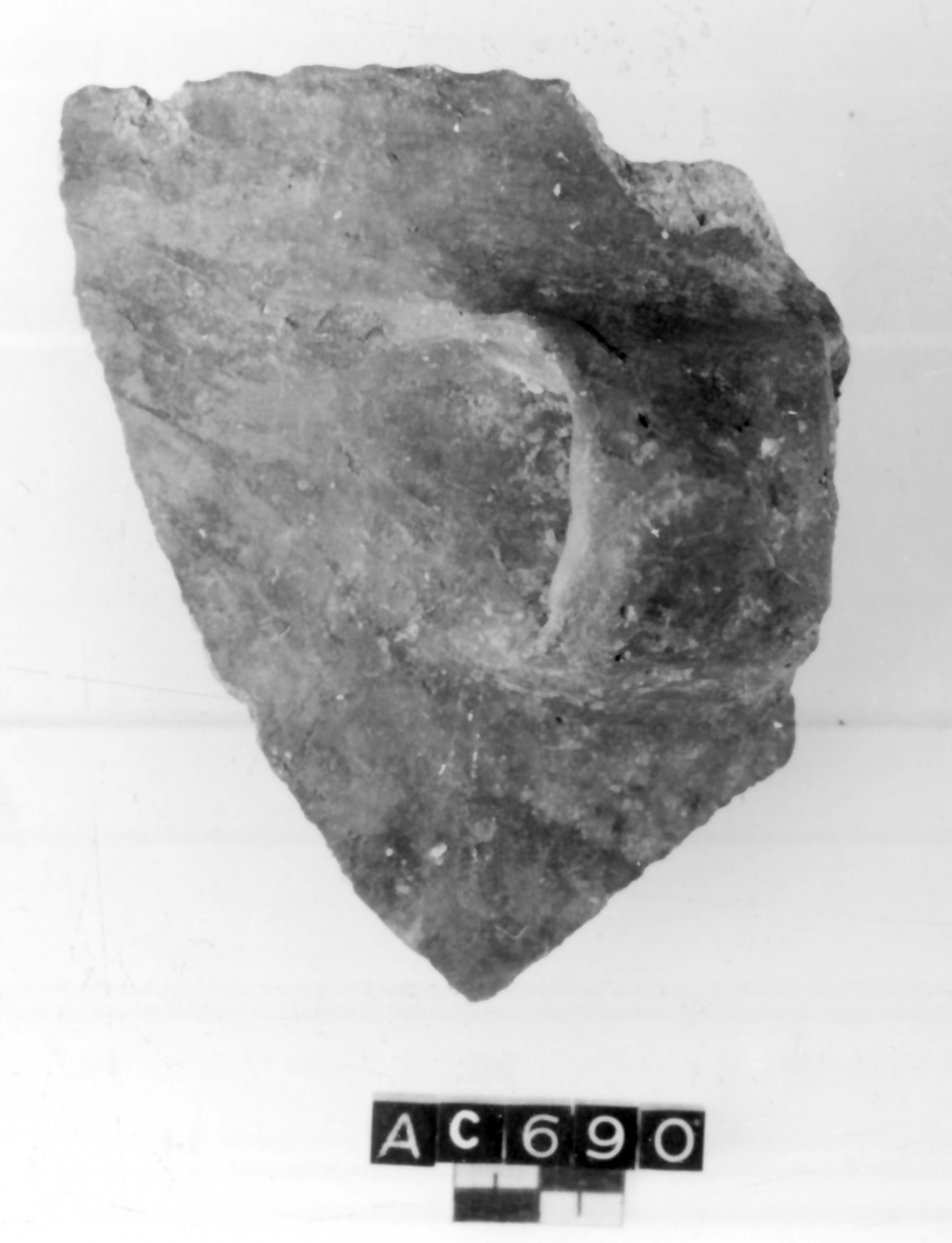 Frammento di bicchiere. Orlo arrotondato, con piccole tacche impresse; spalla leggermente curvilinea sulla quale si imposta verticalmente un'ansa nastriforme ad anello, leggermente insellata; ventre curvilineo. Impasto non depurato. Superfici levigate con tracce di steccature. Colore nero con macchie più chiare