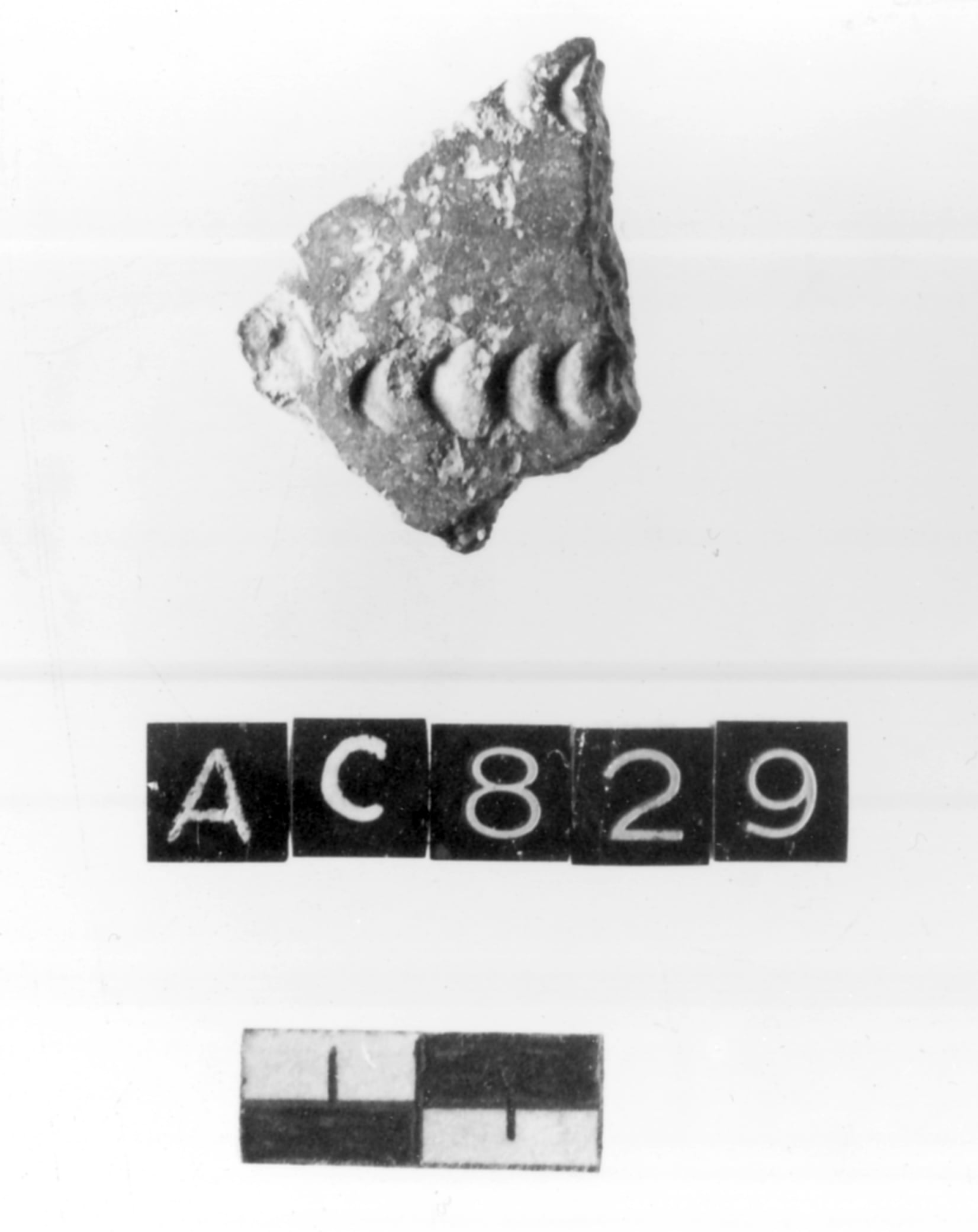 Frammento di vaso, la cui forma non è riconoscibile, decorato con linee verticali di impressioni ottenute con un punzone ad estremità rotonda. Impasto poco depurato. Superficie lisciate. Colore nero