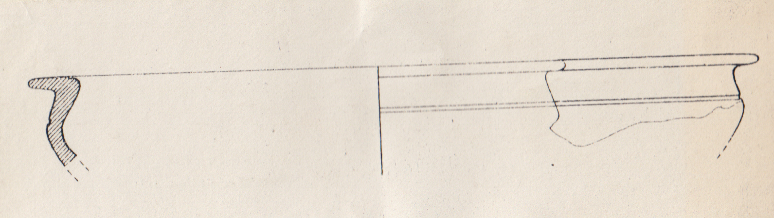 Frammento di labbro piatto e di corpo prima poco svasato con solcatura orizzontale, poi rastremato convesso, di grande coppa in ceramica comune. Non è possibile avanzare alcuna considerazione per mancanza di confronti e di contesto significativo. Argilla beige, ben depurata e abbastanza compatta, con frattura netta; lavorazione al tornio