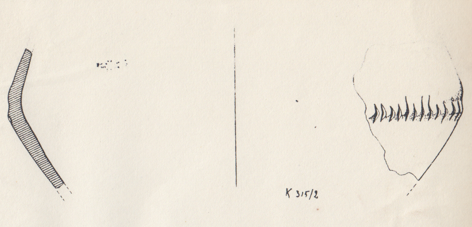 Frammento di parete, con serie di tacche in corrispondenza del diametro massimo, di recipiente da fuoco in ceramica comune ("rozza terracotta scura"). Lavorazione al tornio lento; impasto nerastro con inclusi bianchi