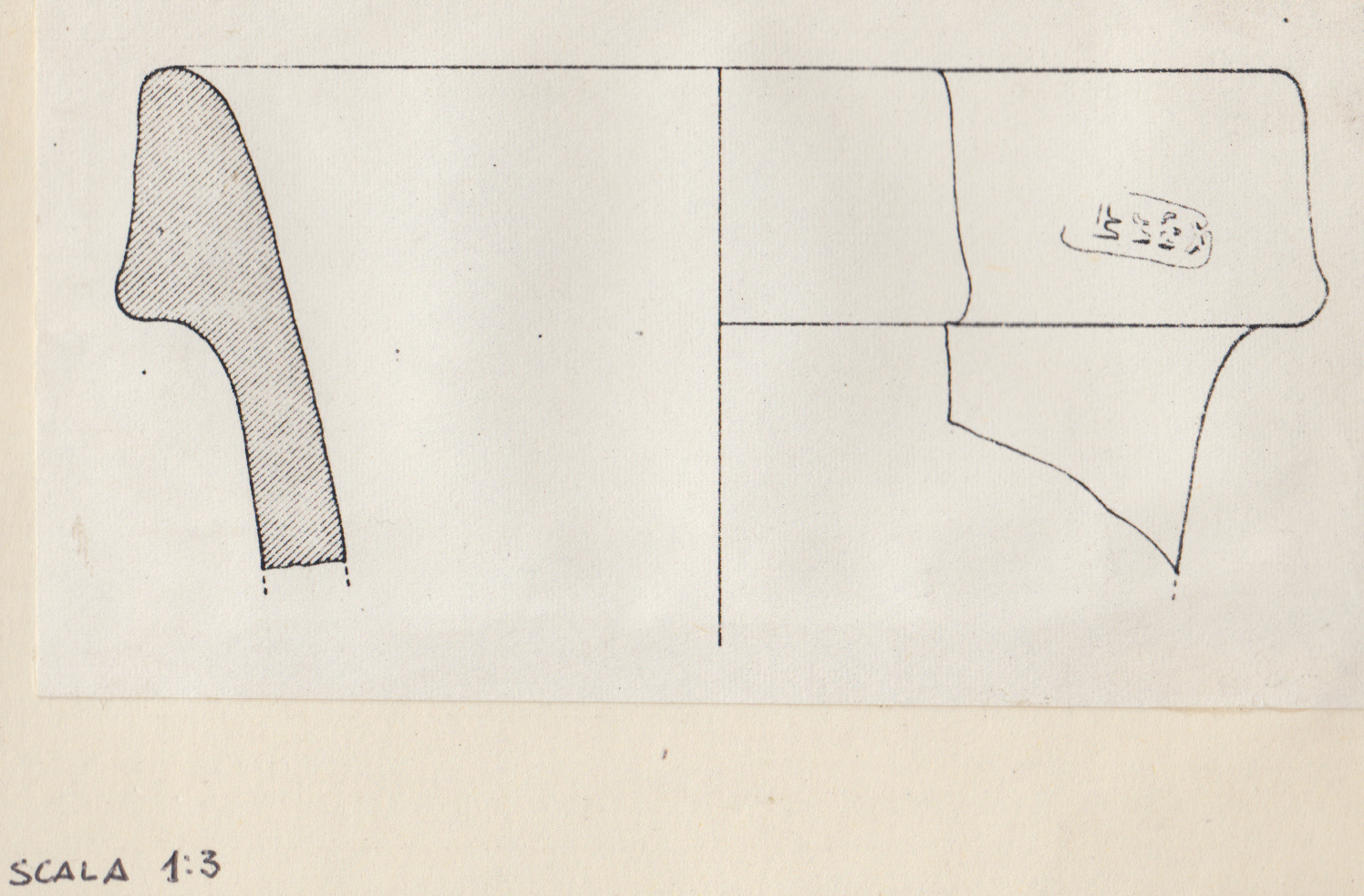 Orlo di anfora, a profilo triangolare non differenziato dal collo, con bollo L. SEX. impresso a lettere rilevate entro cartiglio rettangolare arrotondato sui lati brevi (mis. max.: 2.5 x 1). Il pezzo è riferibile ad un'anfora vinaria Dressel 1A. Il bollo, già noto, è attestato tra l'altro sul collo di una Dressel 1 proveniente da un livello augusteo di un giacimento sottomarino vicino all'Ilôt de Brescou. Argilla ad impasto quasi compatto; colore interno ed esterno bruno pallido; dimagrante abbondante di colore bianco