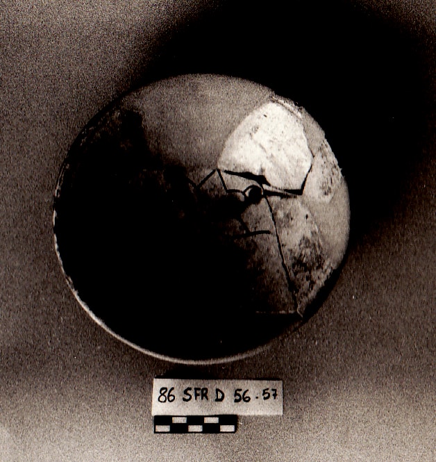 Piatto con corpo tronco conico, con tesa indistinta. Decoro: archetti su tesa, floreale stilizzato nel cavetto. Impasto di argilla con ossidi