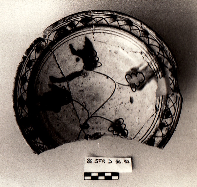 Piatto fondo a corpo tronco conico, orlo arrotondato e distinto all'interno. Decorazione: geometrico floreale. Impasto in argilla con ossidi