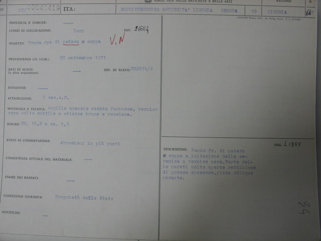 fondo fr. di patera o coppa a imitazione della vernice nera. Parte delle pareti molto aperte, rettilinee, di grosso spessore, piede obliquo pesante. Argilla arancio rosata, farinosa, vernice nera molto sottile a chiazze brune e rossicce