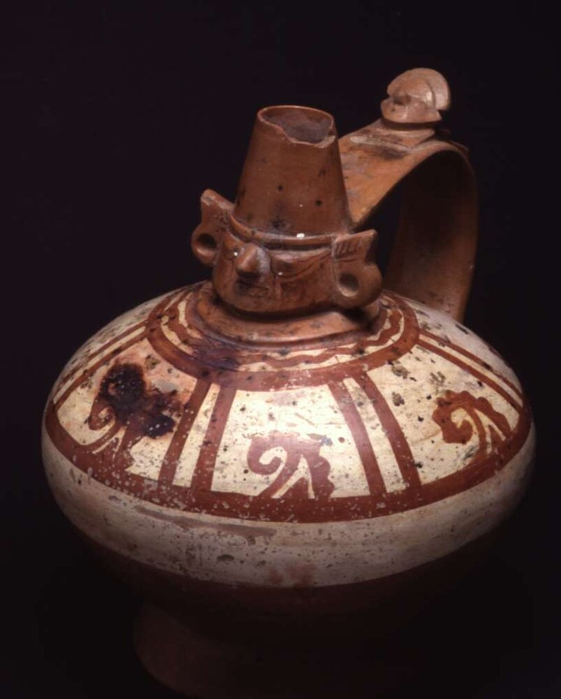 Vaso biconico di colore rosso e crema, con piede distinto e fondo troncoconico concavo. La parte inferiore della camera è dipinta in rosso; la parte superiore è decorata a riquadri con all'interno motivi a onda in rosso su fondo crema. Alla base del collo troncoconico di colore rosso, che costituisce il copricapo, è raffigurato un volto umano con occhi a rilievo, naso, orecchie e rocchetti auricolari sporgenti, lineamenti e pitture facciali dipinte in nero. Una figurina plastica antropomorfa, con corpo a rilievo e testa con copricapo semilunato a tutto tondo, è sdraiata sull'ansa posteriore nastriforme