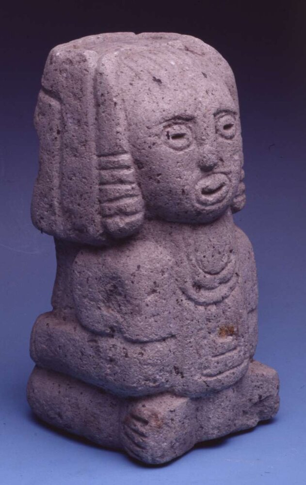 Scultura bifronte di colore grigio chiaro. La parte anteriore raffigura un personaggio maschile inginocchiato, con le braccia piegate e le mani con le dita incise poggiate sul ventre. Il volto ha naso a rilievo, occhi e bocca incisi ed è incorniciato da un copricapo con doppia incisione lineare sulla fronte. La parte posteriore raffigura il busto e la testa di un personaggio femminile. La donna ha una capigliatura a trecce incisa, naso a rilievo, occhi e bocca incisi e decorazioni geometriche incise sul petto. Ai lati sono visibili le braccia abbozzate