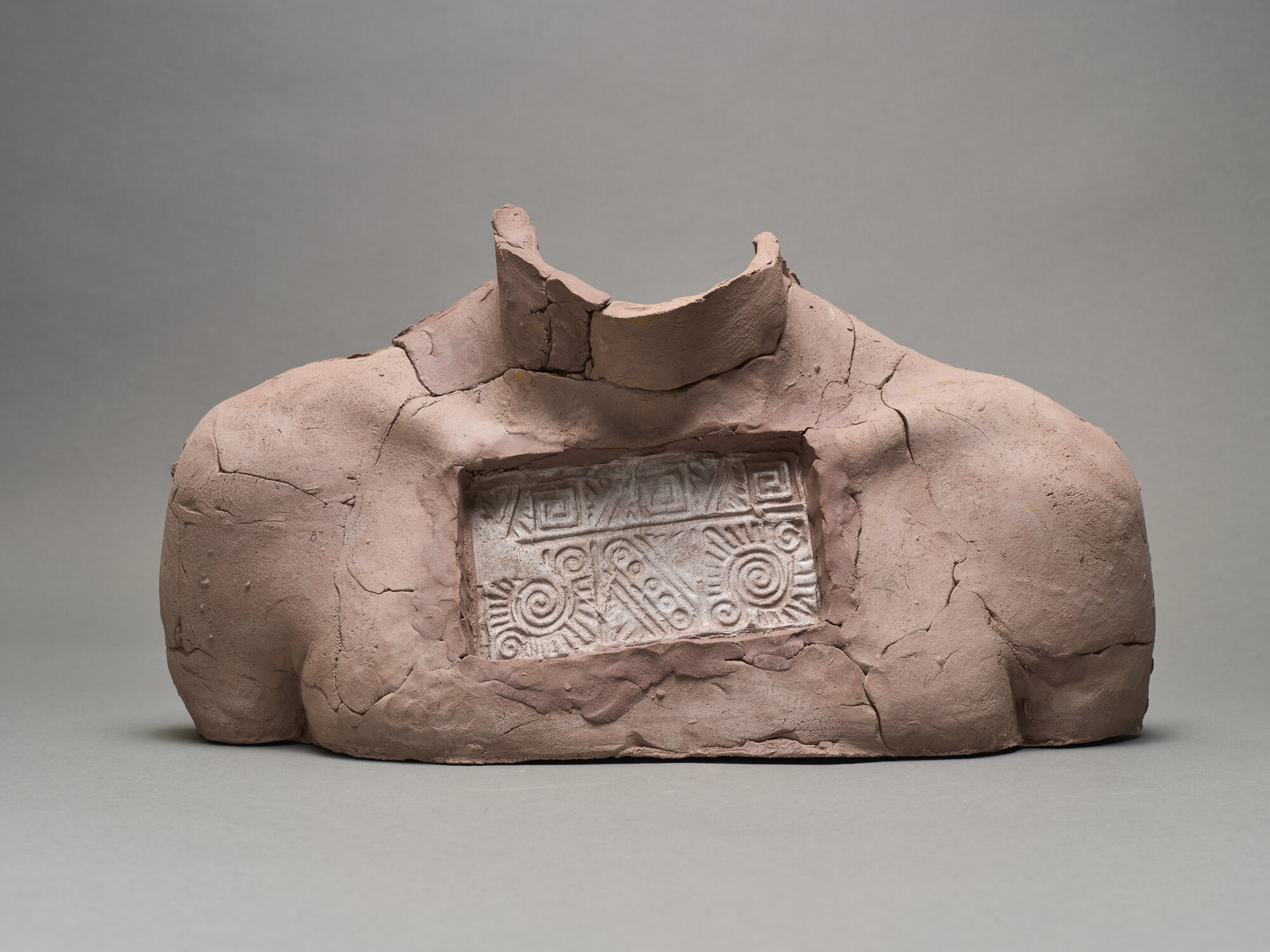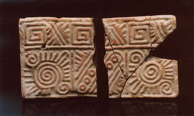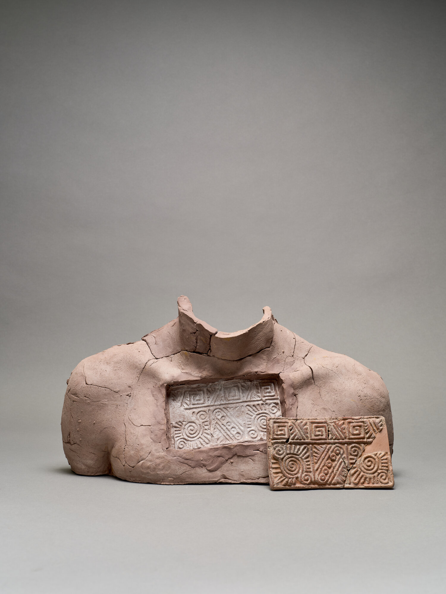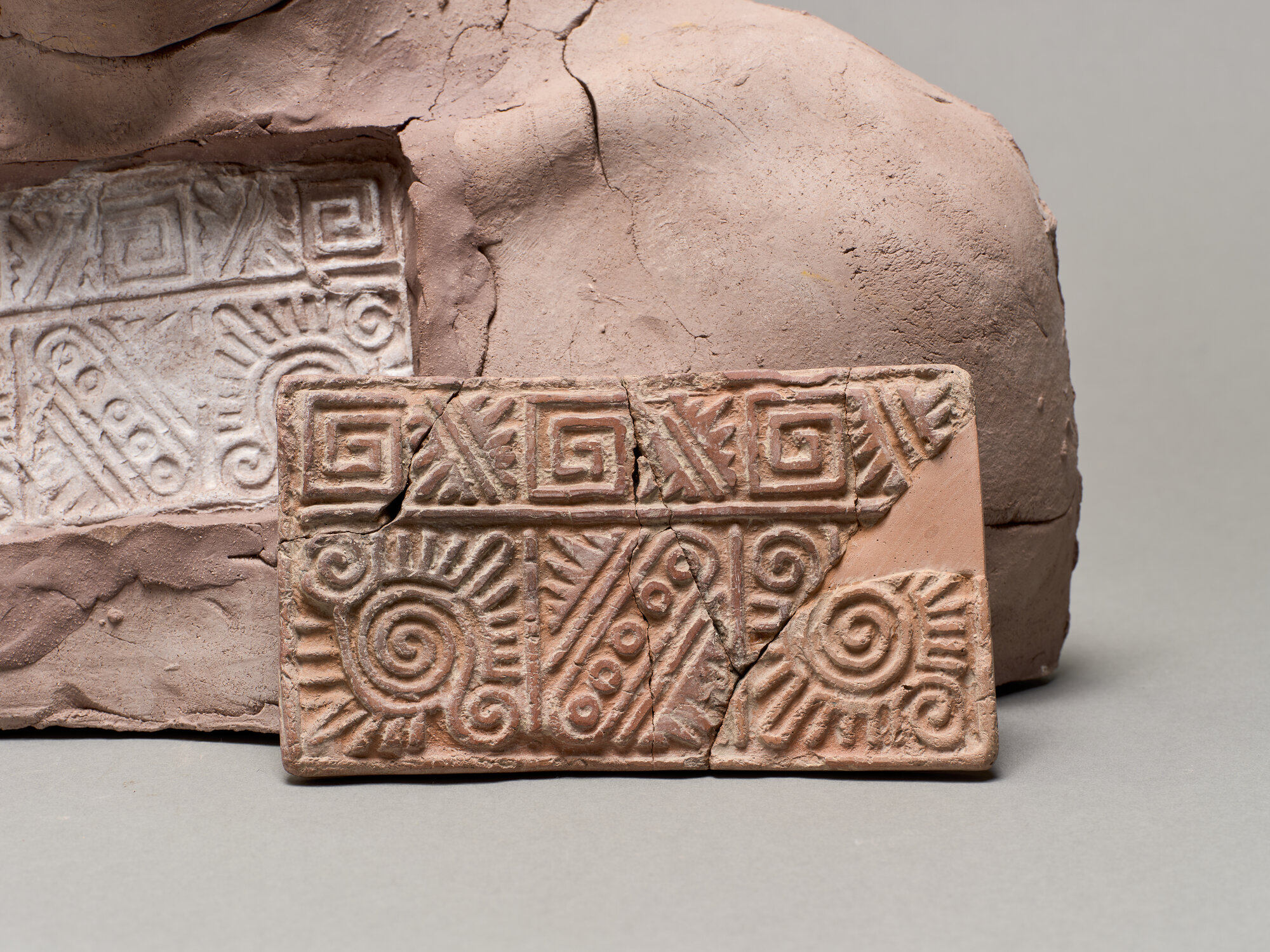 Stampo di colore rosso ocra dalla forma rettangolare. La superficie leggermente concava è decorata con motivi a greca, spirali, volute e motivi curvilinei a incisione in negativo. Sul retro resta traccia dell'innesto dell'impugnatura
