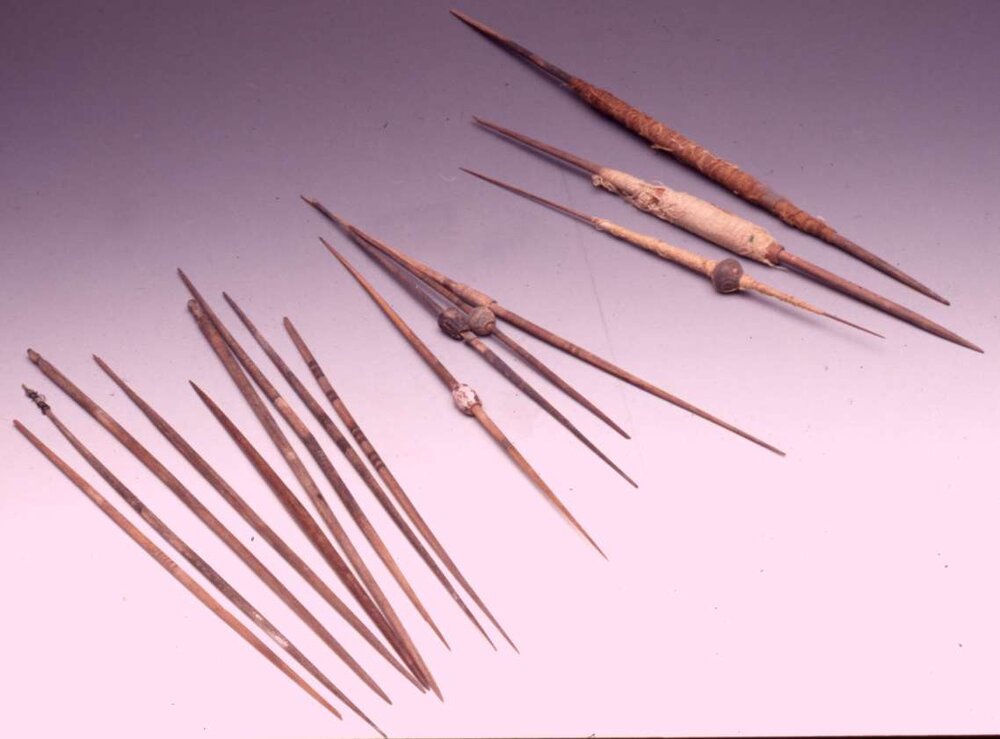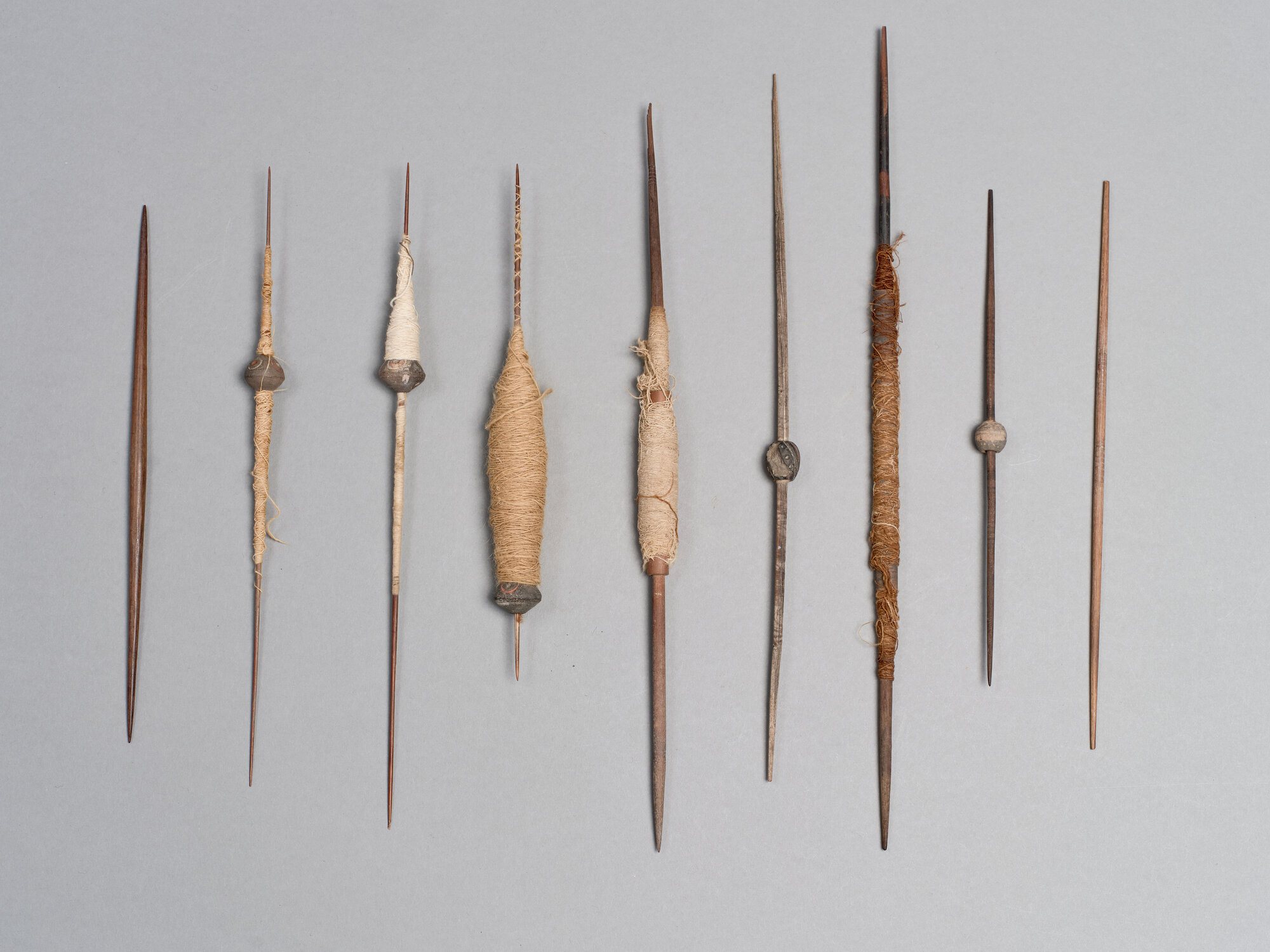 3) Sedici fusi di cui nove dipinti a bande policrome. Due hanno una sola estremità appuntita e l'altra intagliata. Quattro con fusaiole, di cui una in canna e tre in terracotta incisa e dipinta, tre con filo di cui uno con fusaiola incisa e dipinta e due con ferma filo in canna