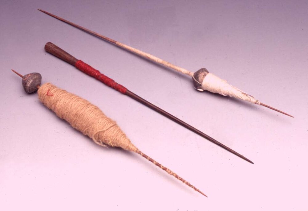 1) Tre fusi con filo, di cui due con fusaiola in terracotta incisa con motivi circolari dipinti e uno appuntito solo a un'estremità.