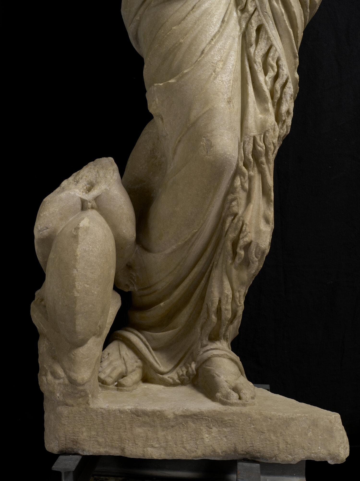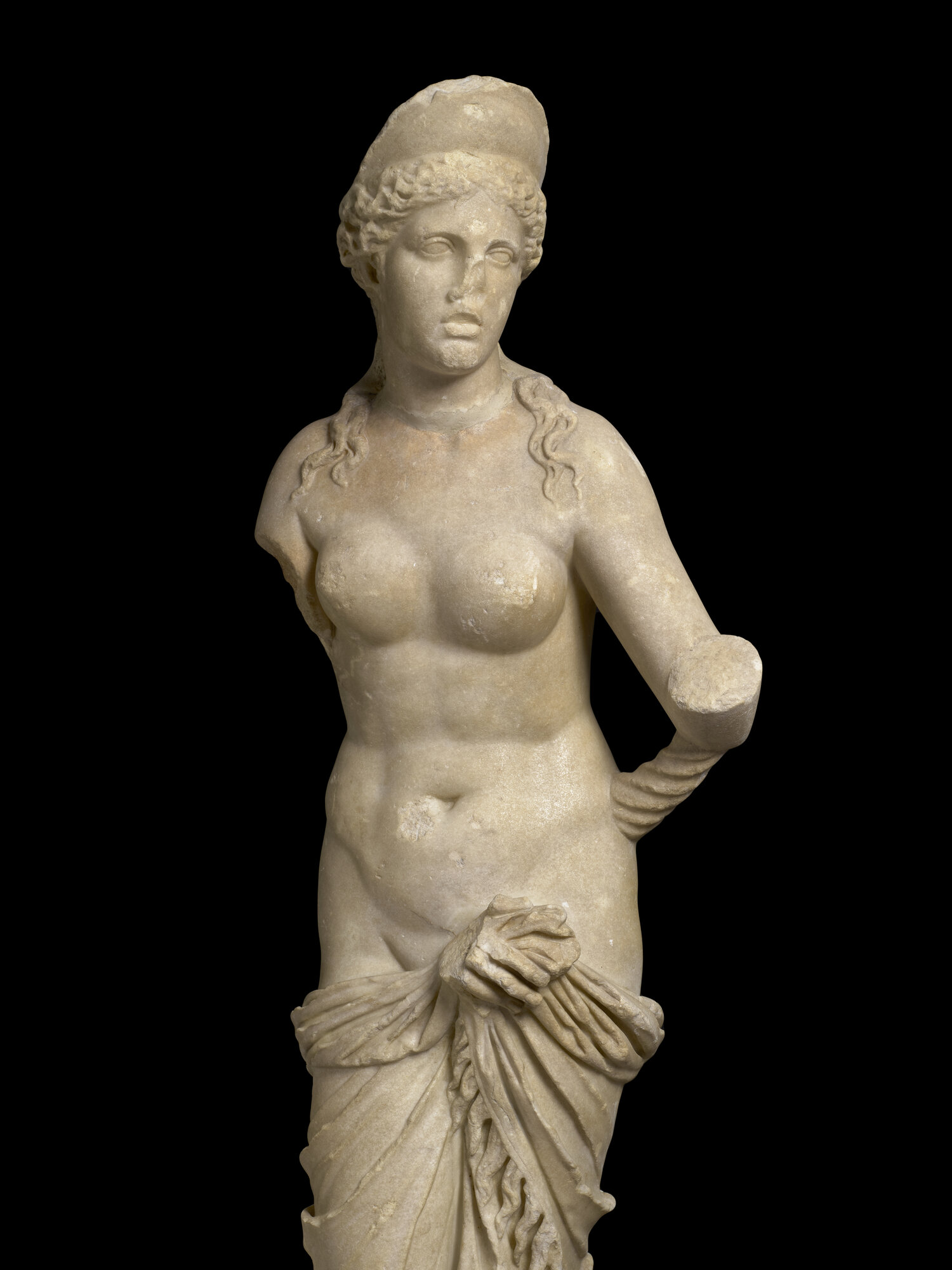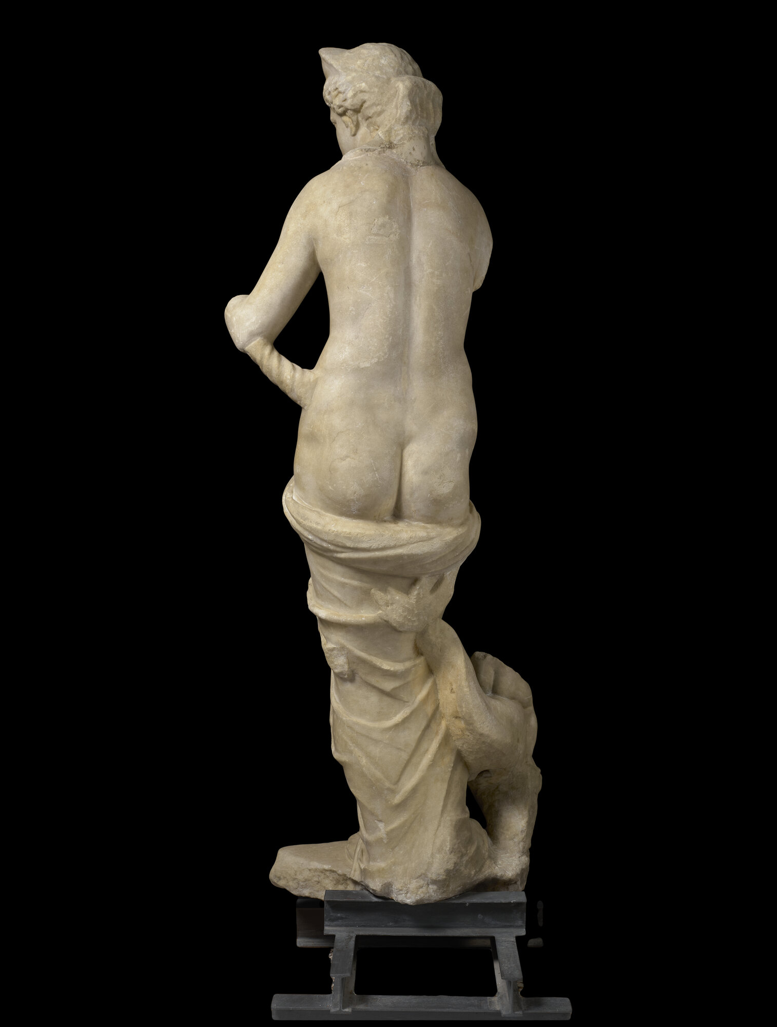 La statua, proveniente da Villa Giustiniani-Cambiaso, è nuda eccetto che per il panneggio, costituito da frange con un accentuato effetto coloristico, raccolto attorno alle gambe e trattenuto dalla mano destra all'altezza del pube. Il peso del corpo è sostenuto dalla gamba sinistra mentre la destra piegata è spostata verso l'esterno. la testa, ornata da un diadema che la identifica come la dea Afrodite, è volta verso sinistra, come il busto. il braccio sinistro portato in avanti reggeva probabilmente uno specchio. a sinistra un sostegno di a forma di delfino forse cavalcato da un erote. una frattura nella parte posteriore della gamba segnala che era presente un altro sostegno. la capigliatura è resa con tratti di trapano brevi nella tecnica detta "a ponticelli" ed è divisa al centro in due bande che si raccolgono sulla nuca in un nodo. I capelli sono più delineati sul lato destro, veduta principale dell'opera (posta in origine in una nicchia) mentre sul sinistro sono più abbozzati. il volto di forma ovale presenta due riccioli al centro della fronte. Gli occhi, segnati all'angolo interno da un piccolo foro, hanno palpebre spesse circondate da un incavo che rende lo sguardo particolarmente intenso. la bocca piccola è segnata da un leggero infossamento agli angoli mentre il mento rotondo accentua la compattezza del volto. le forme, sobrie, sono più articolate nel ventre e nell'addome. la superficie del dorso è resa in modo piuttosto accurato, meno il tessuto e mentre tra la testa e le spalle è presente un ingrossamento per rinforzare il punto debole dell'opera, particolare tipico della produzione di Pamphilia. La statua era collocata in origine in Villa Giustiniani Cambiaso (Genova Albaro), per poi essere trasferita Palazzo Rosso dopo la guerra quando assieme ad altre opere versava in stato di abbandono nel giardino della villa