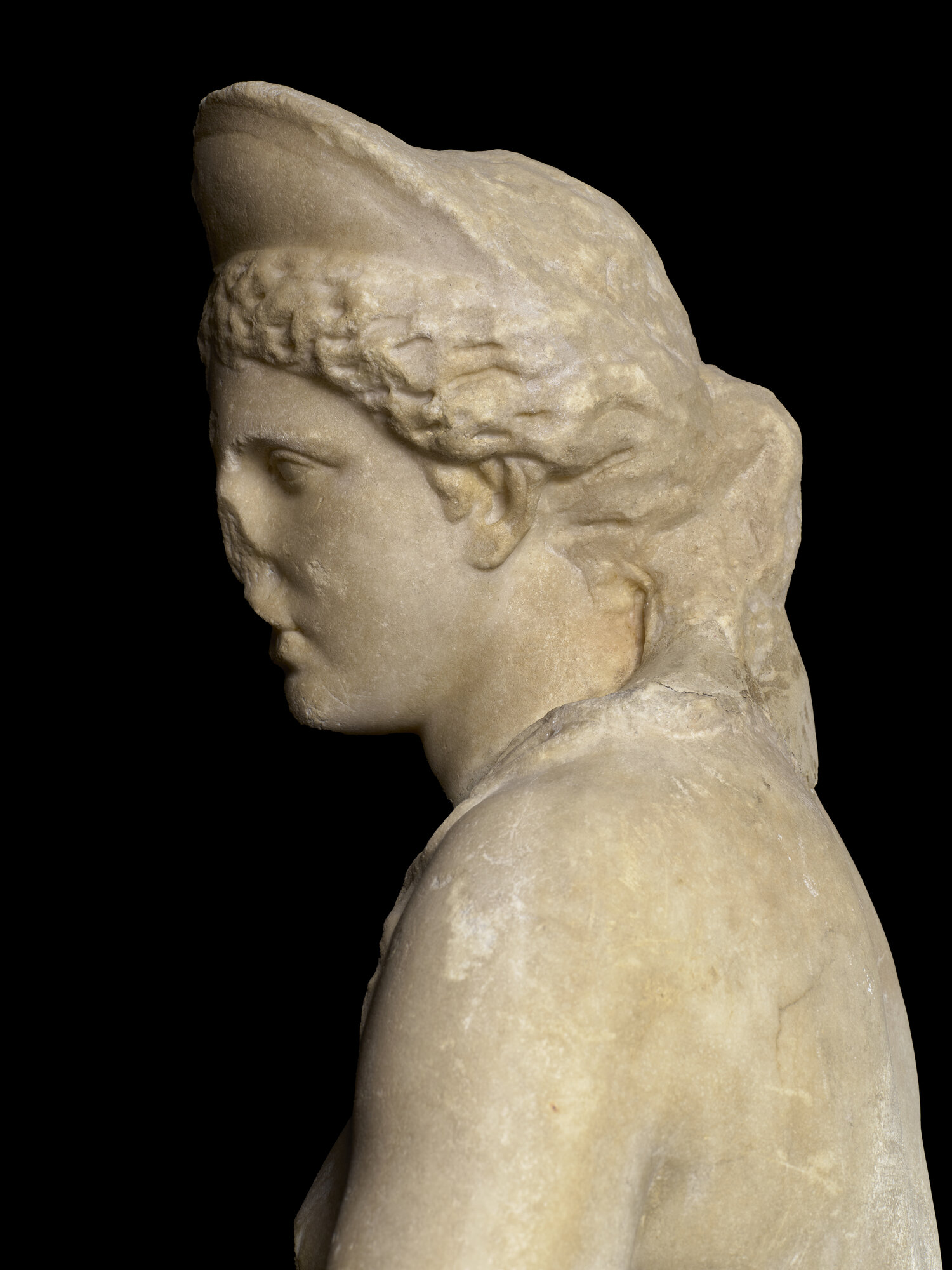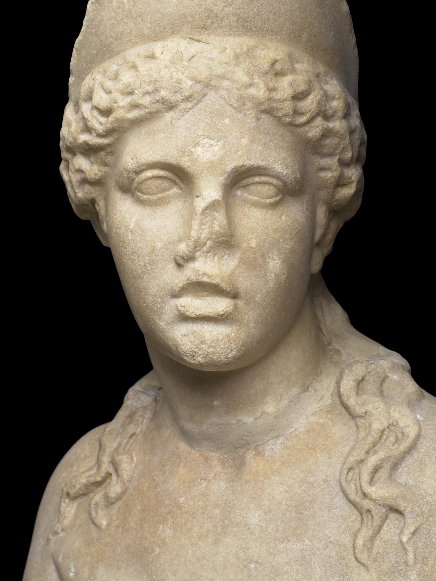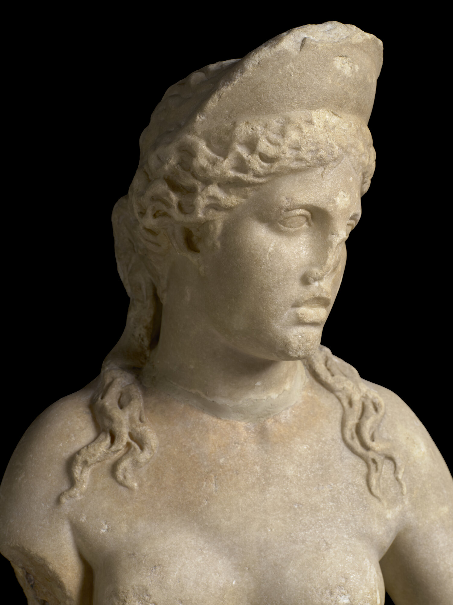 La statua, proveniente da Villa Giustiniani-Cambiaso, è nuda eccetto che per il panneggio, costituito da frange con un accentuato effetto coloristico, raccolto attorno alle gambe e trattenuto dalla mano destra all'altezza del pube. Il peso del corpo è sostenuto dalla gamba sinistra mentre la destra piegata è spostata verso l'esterno. la testa, ornata da un diadema che la identifica come la dea Afrodite, è volta verso sinistra, come il busto. il braccio sinistro portato in avanti reggeva probabilmente uno specchio. a sinistra un sostegno di a forma di delfino forse cavalcato da un erote. una frattura nella parte posteriore della gamba segnala che era presente un altro sostegno. la capigliatura è resa con tratti di trapano brevi nella tecnica detta "a ponticelli" ed è divisa al centro in due bande che si raccolgono sulla nuca in un nodo. I capelli sono più delineati sul lato destro, veduta principale dell'opera (posta in origine in una nicchia) mentre sul sinistro sono più abbozzati. il volto di forma ovale presenta due riccioli al centro della fronte. Gli occhi, segnati all'angolo interno da un piccolo foro, hanno palpebre spesse circondate da un incavo che rende lo sguardo particolarmente intenso. la bocca piccola è segnata da un leggero infossamento agli angoli mentre il mento rotondo accentua la compattezza del volto. le forme, sobrie, sono più articolate nel ventre e nell'addome. la superficie del dorso è resa in modo piuttosto accurato, meno il tessuto e mentre tra la testa e le spalle è presente un ingrossamento per rinforzare il punto debole dell'opera, particolare tipico della produzione di Pamphilia. La statua era collocata in origine in Villa Giustiniani Cambiaso (Genova Albaro), per poi essere trasferita Palazzo Rosso dopo la guerra quando assieme ad altre opere versava in stato di abbandono nel giardino della villa