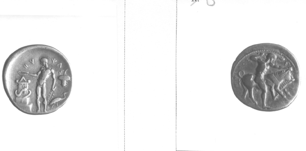 Diritto: Ercole nudo afferra per le corna un toro al galoppo a destra e leva la sinistra con clava. Rovescio: Personificazione del fiume Hypsas stante a sinistra, in atto di libare su un altare, attorno al quale si attorciglia un serpente. Hypsas tiene nella destra una patera e nella sinistra un ramo di alloro. A destra una gru e una foglia di sedano. Sopra iscrizione