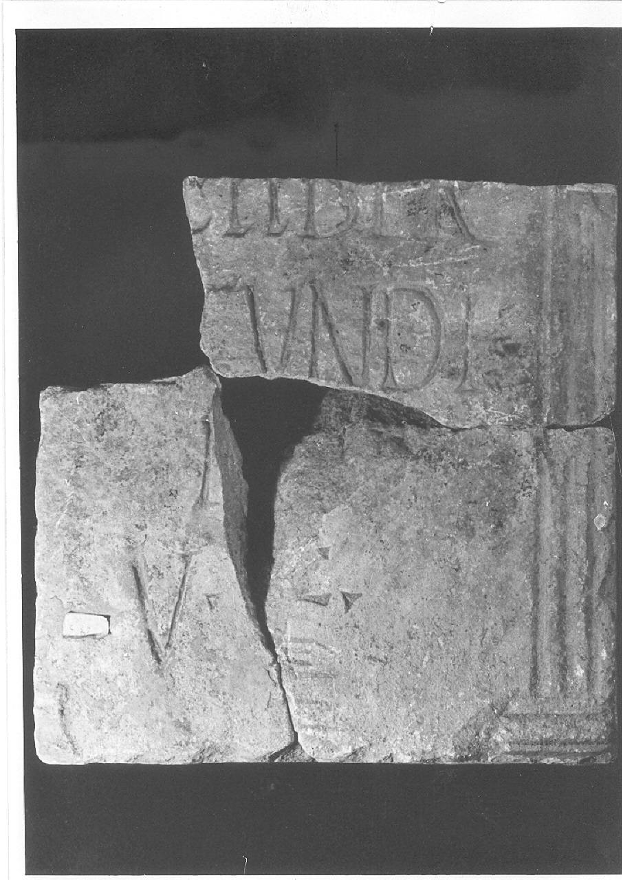 Resti di iscrizione. Altezza lettere: I. 2 cm 7.5; I. 3 cm 7; I. 4 cm 8. Distanza linee: II. 1-2 e 3-4 cm 3.5. Triangoli distinguenti. Lesena scanalata sul lato destro