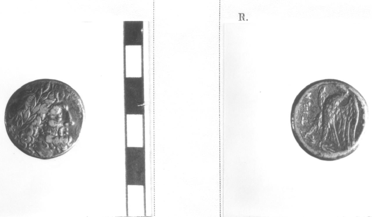 Diritto: Testa laureata di Zeus, a destra; dietro, fulmine. Rovescio: Aquila stante a sinistra; su fulmine; iscrizione