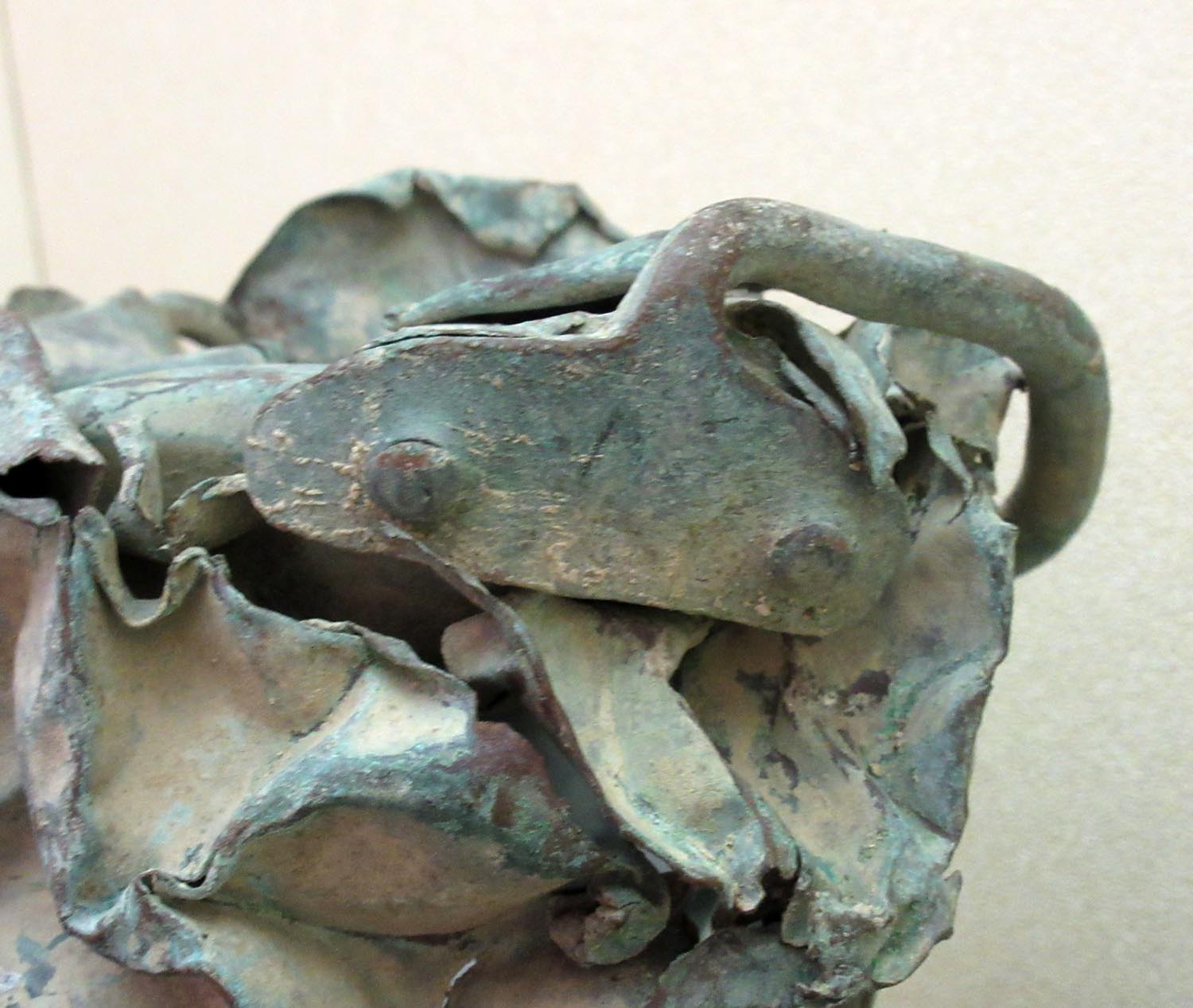 Secchio di bronzo. Corpo a forma di tronco di cono rovescio (il grave danneggiamento subito dal manufatto rende difficile determinarne con precisione il profilo) costituito da una lamina bronzea; fondo lievemente bombato, rinforzato con una ulteriore lamina. Il manico fisso, a sezione circolare, a fusione piena, si allarga in due placchette di attacco ovoidali fissate al recipiente tramite coppie di ribattini poco sotto l’imboccatura
