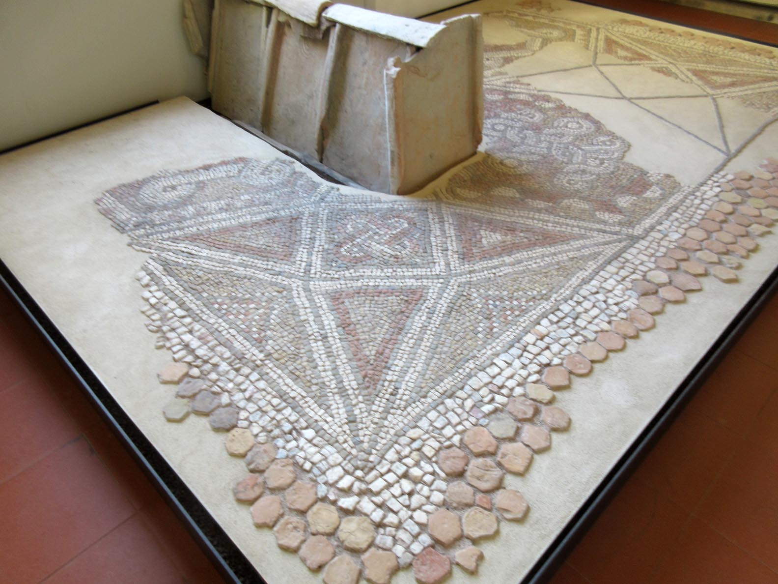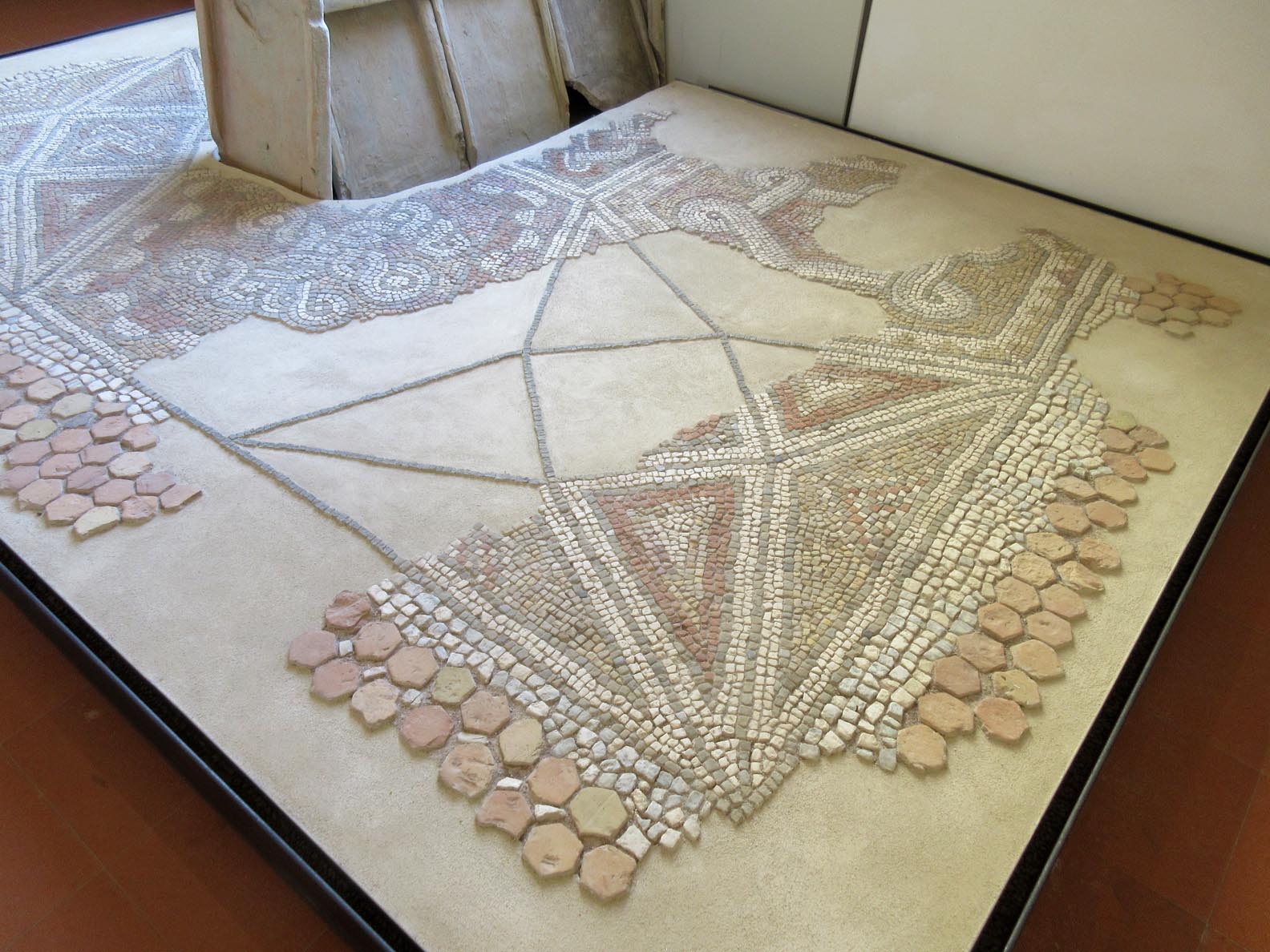 Tratto di pavimento in tecnica mista con bordo a commesso di esagonette fittili (cm 6-7 ca.), realizzate a stampo, e campo in opus tessellato policromo con tessere in calcare di dimensioni medio piccole (cm 1.5-2 ca.)