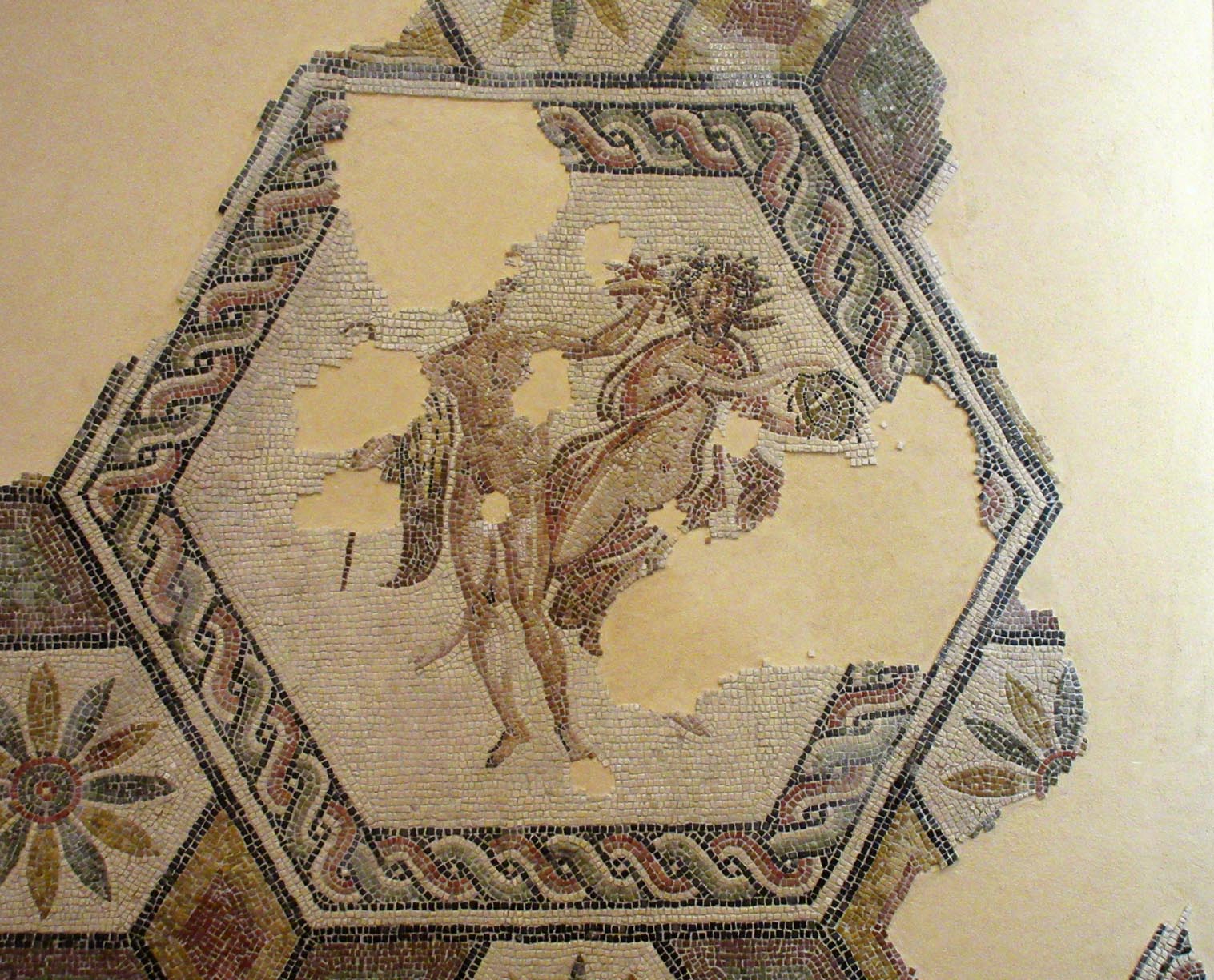 - NOTIZIE STORICO CRITICHE Il tappeto musivo, originariamente, si componeva di quattordici esagoni maggiori dei quali se ne sono conservati solo tre: quello appena descritto; un secondo, che mostra le gambe di due figure, verosimilmente sempre un satiro ed una menade; un terzo, con un cavallo marino cavalcato da una nereide. Le scene rappresentate, dunque, rientrano tutte nell’ambito del thiasos dionisiaco. Il lacerto, come il mosaico con raffigurazione di Vittoria con Gorgoneion (inv. 284936), proviene del pavimento della sala di rappresentanza della sontuosa domus di Palazzo Gioia di cui si distinguono due fasi edilizie la prima databile alla seconda metà del II sec. d.C., la seconda dal IV al V