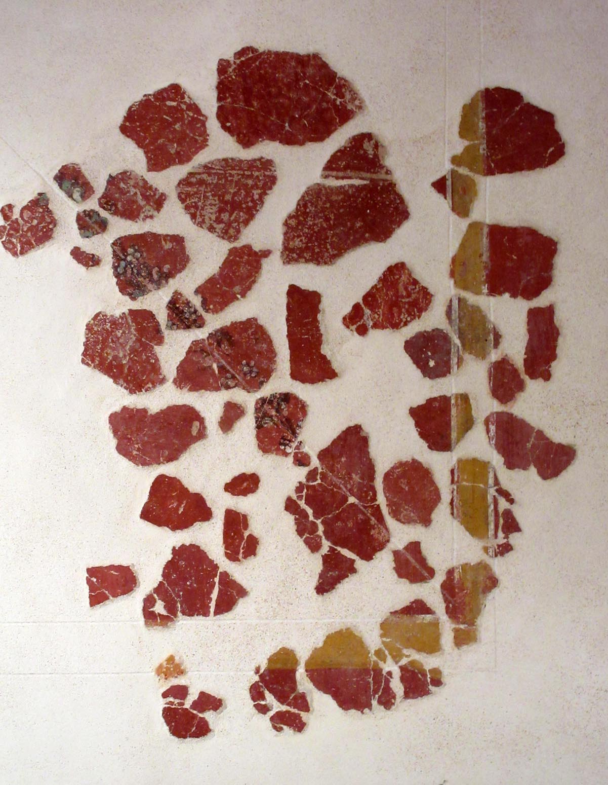 - NOTIZIE STORICO CRITICHE L’affresco era parte della stessa zoccolatura a cui appartiene il frammento a fondo rosso con n. inv. 284940. Gli affreschi provengono da una domus rinvenuta al di sotto di palazzo Arpesella, la quale ha restituito tre pavimenti a commessi laterizi, cementizio e tessellato databili al II sec. a.C., alla fine del I d.C. ed al V secolo