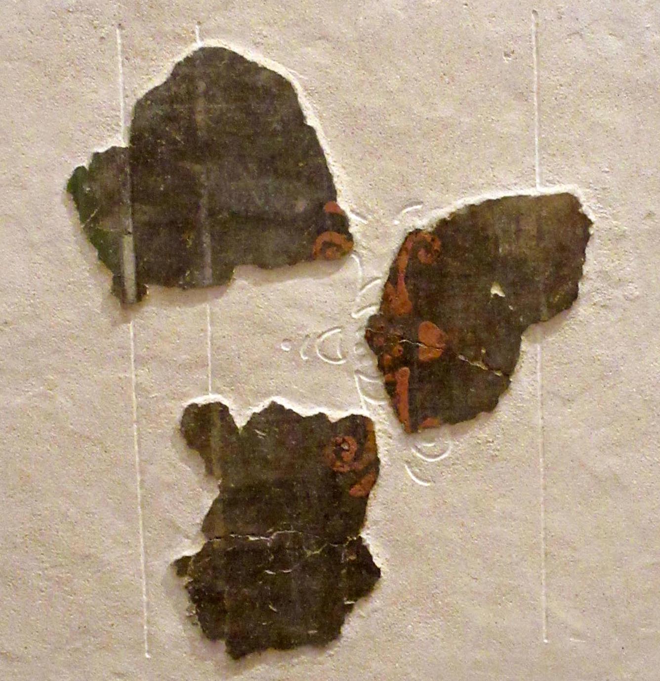 - NOTIZIE STORICO CRITICHE Il frammento, unitamente ad altri due (nn. invv. 284946-284947) ornava un ambiente (I) della prestigiosa domus posta a nord del decumano massimo, dove ora sorge il palazzo Diotallevi. L’edificio, scavato solo in parte, presenta una prima fase edilizia con pavimenti in cocciopesto o semplice spicatum, che verrà profondamente modificata nel II secolo