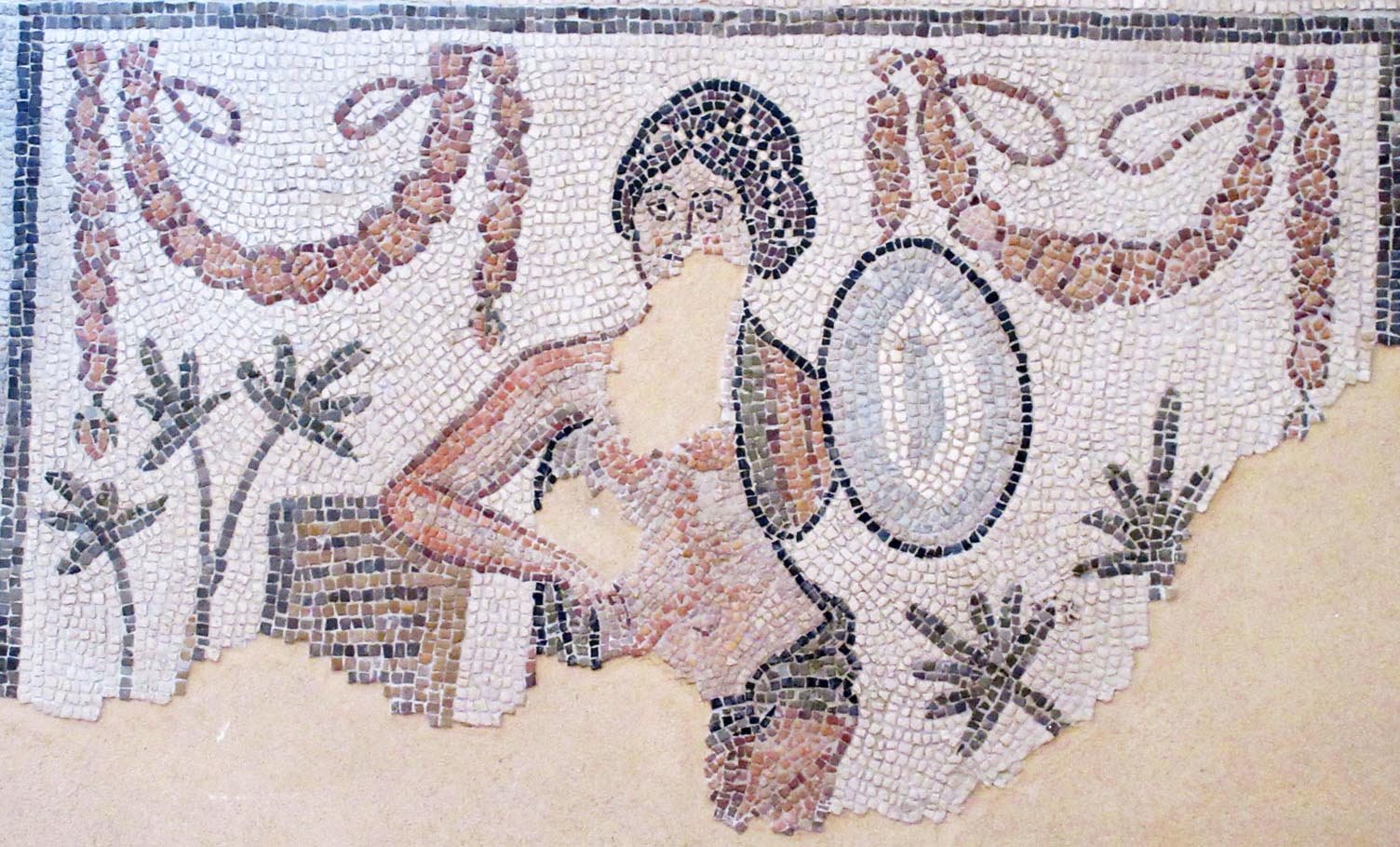 Frammento di tappeto musivo policromo con composizione figurata entro partiture geometriche, in tessere di calcare di dimensioni medio piccole (cm 1-1.5 ca.)