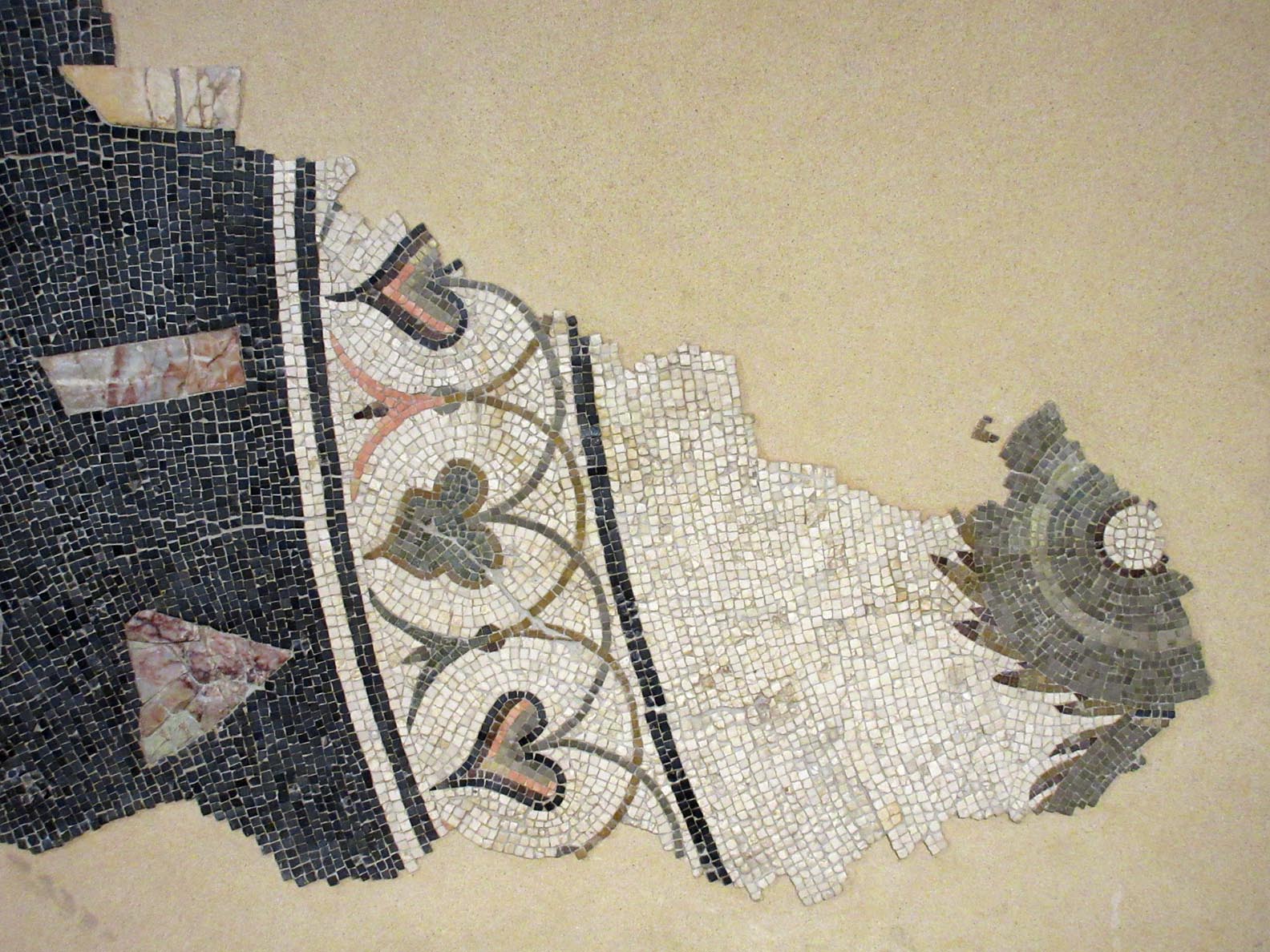 Due frammenti di pavimentazione musiva, campo in opus scutulatum con inserti di marmo policromo su fondo nero e pseudoemblema centrale in tessellato policromo; tessere di piccole dimensioni, inferiori al centimetro