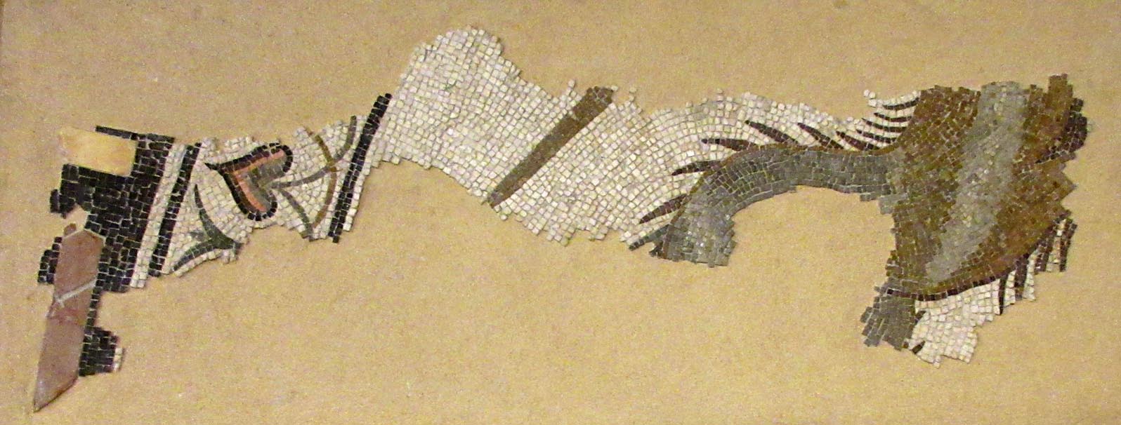 - NOTIZIE STORICO CRITICHE Il pavimento ornava un ambiente del complesso termale individuato nell’area “a mare dell’Arco di Augusto” tra le mura urbiche e via Minghetti, dove si sono individuati tre nuclei di ambienti, articolati in nicchie, absidi ed esedre e completati da un sistema di vasche rivestite di marmo o pietra