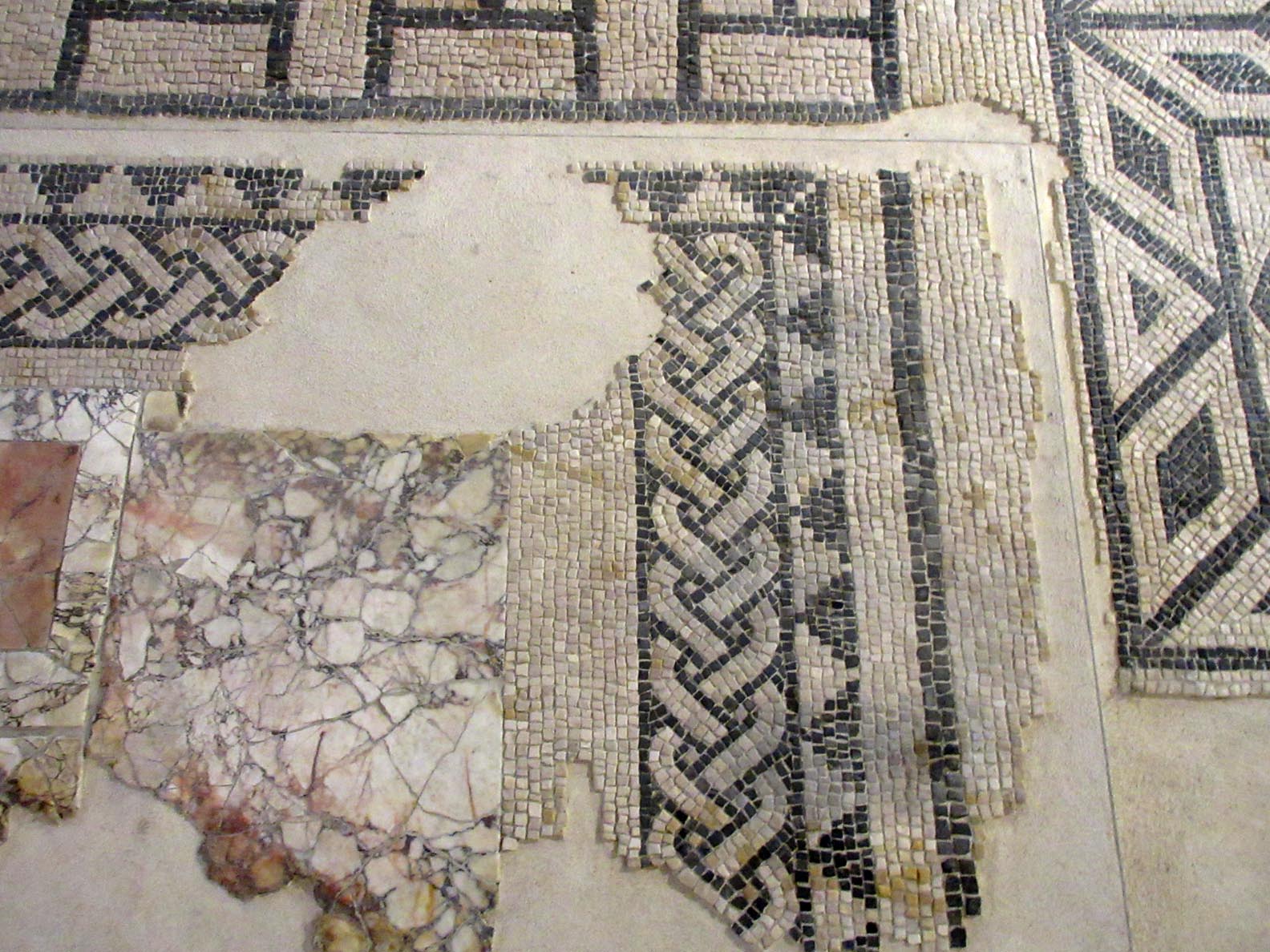 Frammento di pavimento di triclinio in tecnica mista con scansione a T+U: area destinata ai letti tricliniari (U) e zona d’ingresso al vano (braccio orizzontale della T) in tessellato, con tessere in calcare in bianco e nero di circa 1 cm; rettangolo centrale (braccio verticale della T) in sectile di marmi colorati