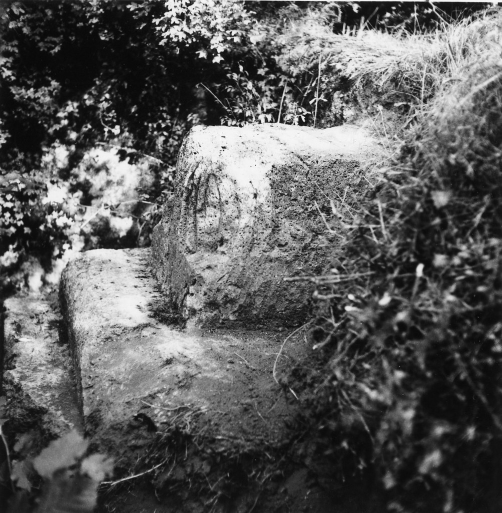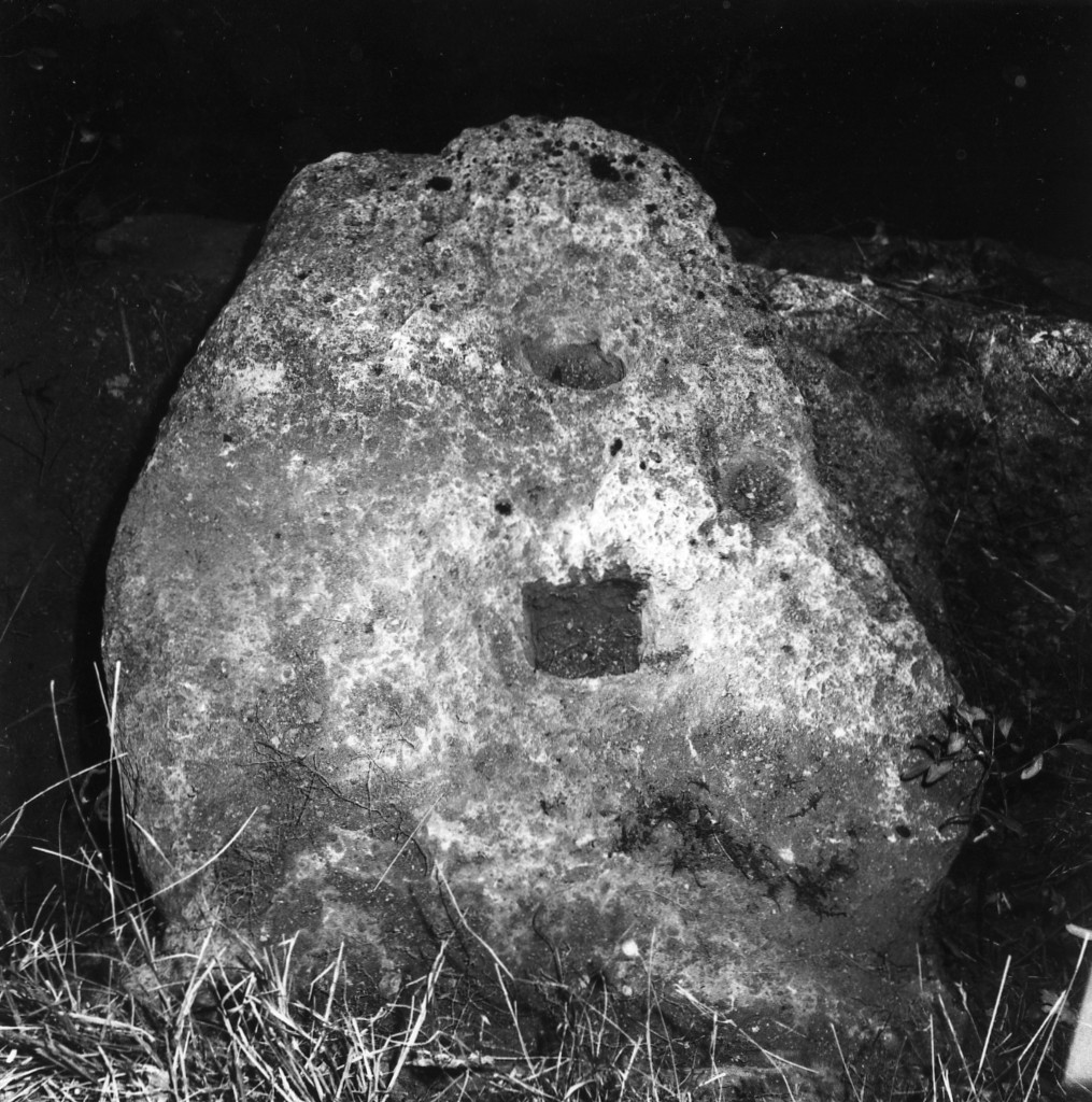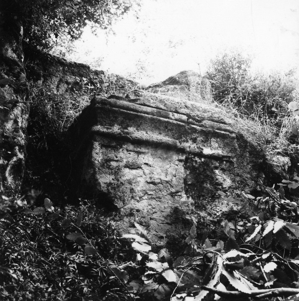 Tufo scolpito. Separata da F.4 da una sporgenza della roccia. La facciata presenta falsa porta a 'proiecturae' ricurve, che giungono, con il loro tratto verticale, a filo con lo spigolo della facciata. Coronamento della fronte: toro assai aggettante e accuratamente arrotondato, alto cm.7,5; 'becco di civetta', arretrato di cm.7,5 rispetto al bordo del toro (alt. cm.17,5); seguono un secondo toro (alt. 7,5) e un fascione (alt. 11). Le modanature, ben eseguite ed accuratamente levigate, sono realizzate anche sui fianchi, fino alla roccia del fondo che dista dalla fronte cm.122. Sulla piattaforma, arretrato cm.22 dalla linea della fronte, s'imposta il plinto stondato, largo cm.140, profondo cm.100, alto cm.24, ben conservato nella parte sinistra, mentre la destra presenta una vasta scheggiatura; arretrato cm.28 dalla faccia anteriore del plinto, sorge il portacippi di forma inconsueta (alt. cm.56; largh. alla fronte 64, sulla parete di fondo cm.54; aggettante cm.76); i fianchi presentano, in pianta, andamento fortemente convesso; in corrispondenza degli spigoli verticali anteriori è stata scolpita una serie di costolature, interpretabili come la successione di tre foglie ovali e lievemente lanceolate, sovrapposte in ordine decrescente verso la fronte; nel profilo, le costolature appaiono arcuate al centro, con la concavità rivolta alla fronte. Tale decorazione è conservata interamente solo sul lato destro, mentre a sinistra resta visibile solo per pochi centimetri di altezza. Anche gli spigoli dello zoccolo, su cui insiste l'elemento vegetale, esibiscono un intaglio concavo. Sul piano del portacippi, tre fori: uno di forma quadrangolare, in posizione centrale, largo cm.7 e lungo cm.8; gli altri circolari, con diam. rispettivamente di cm.8 e cm.7. Al di sotto della facciata, si apre il dromos, largo cm.80 ca., fortemente spostato a sinistra rispetto all'asse del monumento, quasi allineato con la trincea laterale; con andamento pianeggiante conduce alla camera che si apre a ca. m.3 dal piede della facciata; la cella, ingombra di terra a pianta quadrangolare (m.2 ca. di lato). Il soffitto piano presenta evidenti i segni lasciati dallo strumento impiegato nello scavo; la connessione tra soffitto e pareti è ben netta