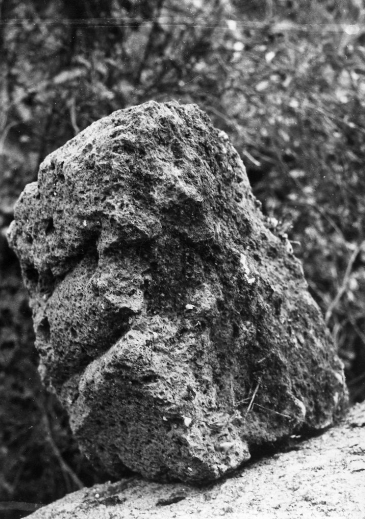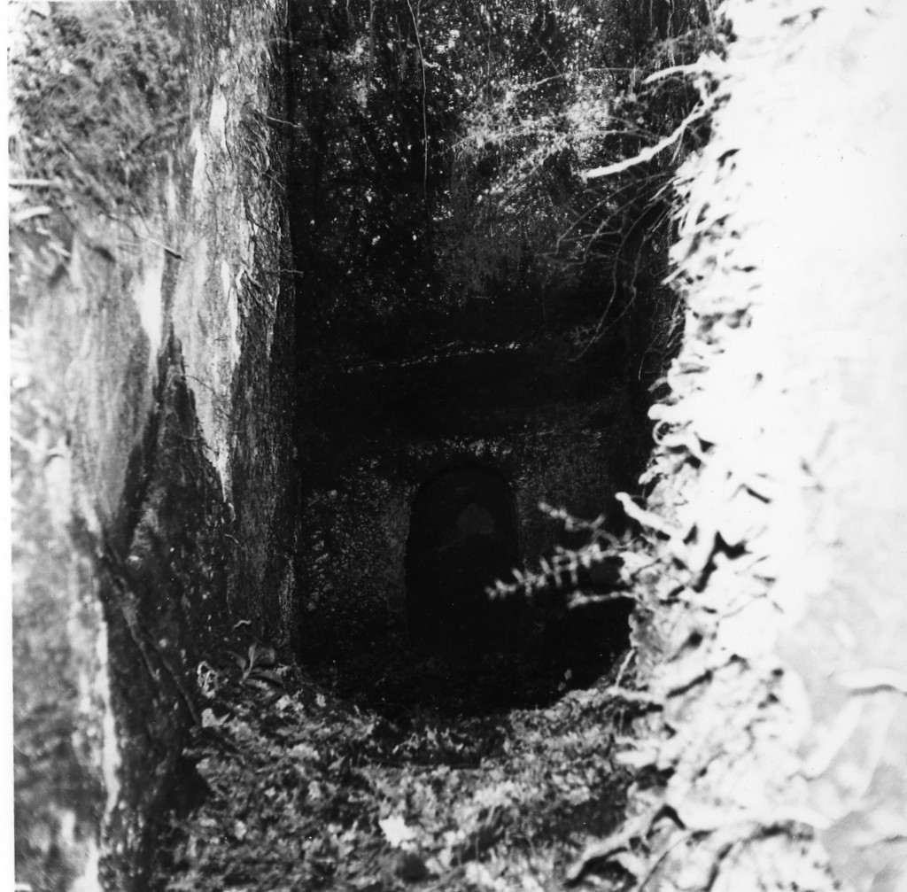 Scolpita. Il dado si imposta al centro di una terrazza, larga m.4 circa, profonda m.3,50 circa, immediatamente a sinistra della "Tomba del Sileno" (Monte Rosello, tomba n.4), a un livello lievemente più alto. La parete di fondo appare avanzata, rispetto a quella della terrazza adiacente, di circa cm.55. Il monumento, che dista cm.110 circa dalla fronte, 130 dal lato destro e 110 dal lato sinistro della terrazza, è separato anche dalla parete di fondo, dalla quale lo separa un corridoio (largo cm.75 a destra, 85 a sinistra). Largo cm.160, profondo cm.172, il dado, conservato per un'altezza di soli cm.90 sulla fronte, 80 sulla parte posteriore, non presenta tracce di modanature né della sagoma della falsa porta; nella parte anteriore è preceduto da una sorta di gradino, alto cm.20 e largo cm.36 (zoccolo o piano di posa per blocchi lavorati a parte?). Del coronamento si conservano alcuni frammenti, raccolti sul pendio immediatamente sottostante; frammento A: il frammento meglio conservato, pertinente ad un angolo del monumento, presenta, per un tratto di cm.37 da un lato, 24 dall'altro, la sequenza delle modanature della fronte quasi al completo (manca soltanto il toro inferiore); becco di civetta, ben arrotonato, alto cm.14, toro, alto cm.7,5, fascione, alto cm.9,5. Frammento B: medesime modanature, ma più consunte. Frammento C: resti di un toro. Frammento D: sagomatura ad angolo retto, forse pertinente alla sovrastruttura superiore (potrebbe trattarsi di parte della piattaforma superiore con l'attacco inferiore del plinto). Un profondo dromos assai ripido, largo, in corrispondenza dell'ingresso alla cella, cm.160, conduce, attraverso un'apertura arcuata larga cm.60, alta 175, ..
