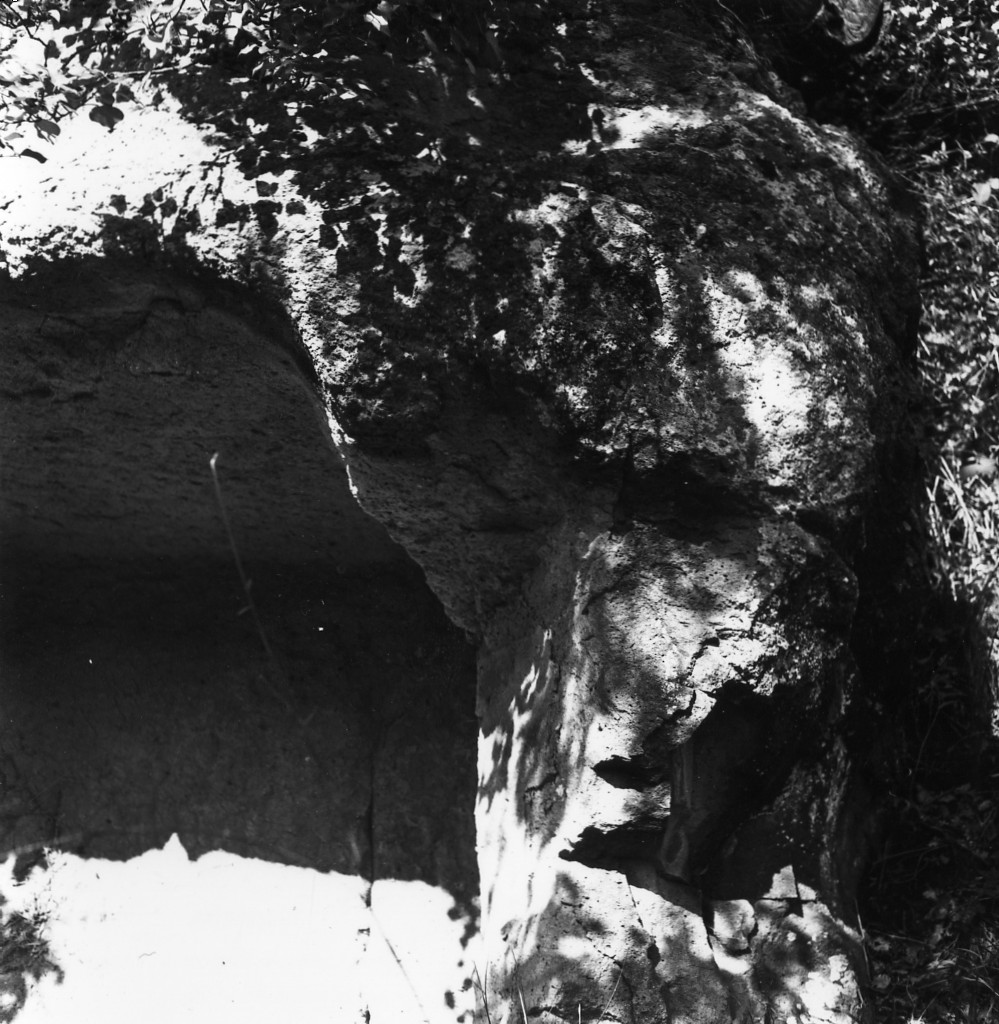 Scolpita. Poche decine di metri a Est della tomba del Sileno (Tomba Monte Rosello n.4), a un livello leggermente più alto, tomba a edicola, assai mal conservata nella struttura esterna. Il monumento si articola in una parte inferiore costituita da due ante sporgenti, larghe cm.77, sormontate da una sovrastruttura probabilmente in origine displuviata alta cm.190 circa. Al centro della fronte si apre un'ampia nicchia rettangolare, larga cm.315, profonda cm.135 e alta attualmente cm.250; in basso, a cm.225 dal soffitto piano, una sorta di gradino aggettante cm.30, fortemente corroso. All'angolo superiore destro, larghe tracce di intonaco bianco, di notevole spessore. A cm.56, dal soffitto, in posizione pressoché centrale, sulla parete di fondo, largo foro circolare (largh. cm.12), poco profondo. Sulle pareti laterali nella parte superiore e presso la fronte, tracce di sagomature a rilievo, interpretabili forse come i lati di capitelli ionici che dovevano essere realizzati sulle ante (alt. complessiva, cm.30; largh. cm.40). La camera pertinente al monumento, in asse con la facciata, si presenta attualmente come una vasta cavità a pianta rettangolare irregolare, larga cm.480 presso la parete di fondo e lunga cm.640 circa. In epoca tarda è stata riadattata a colombario, scavando tre file di loculi sulle pareti (misure medie dei loculi: alt. cm.18, largh. cm.20, profondità cm.28) a sezione curvilinea