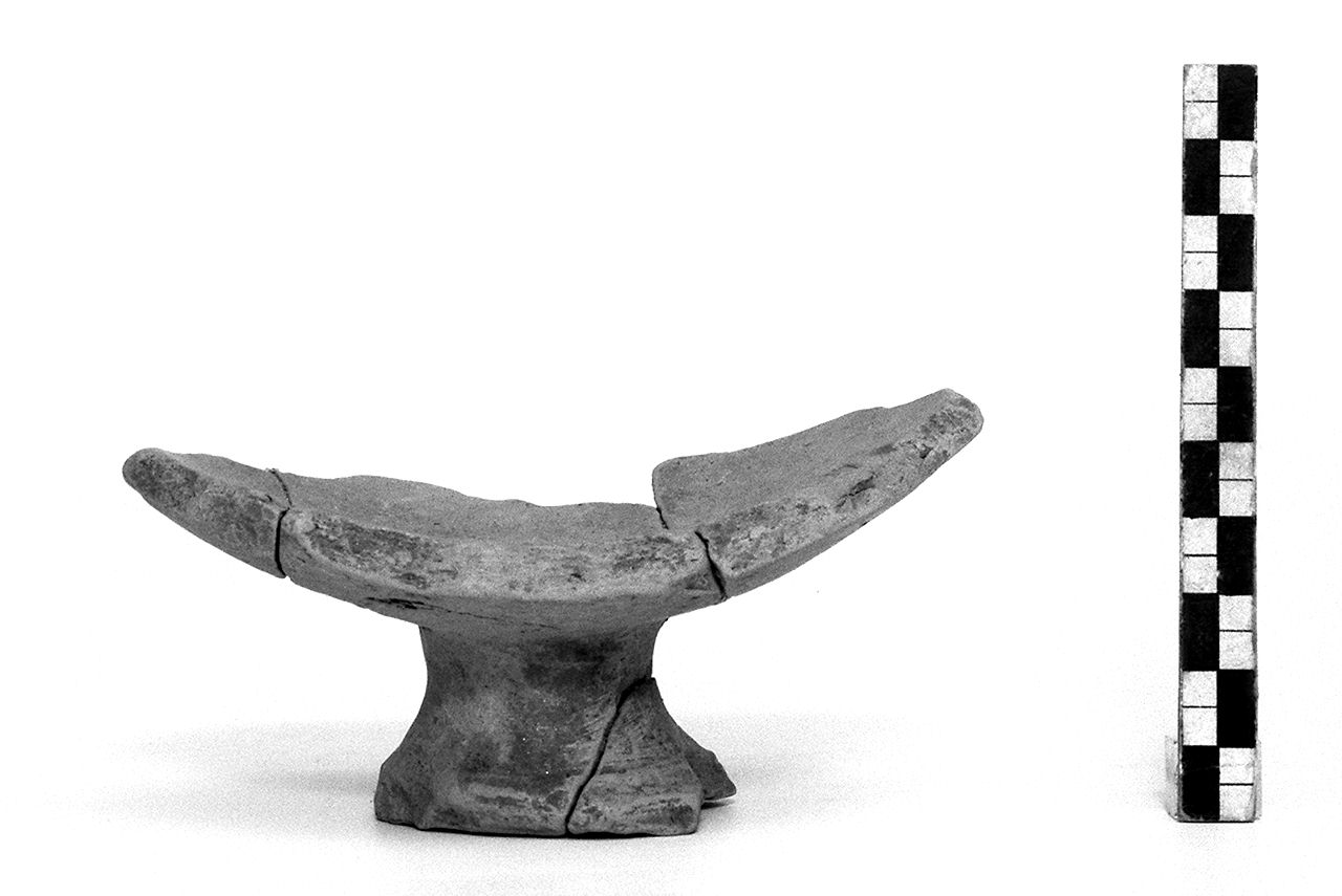 Fondo della vasca ampio, a profilo convesso; alto piede strombato, cavo. Argilla depurata; colore rosato