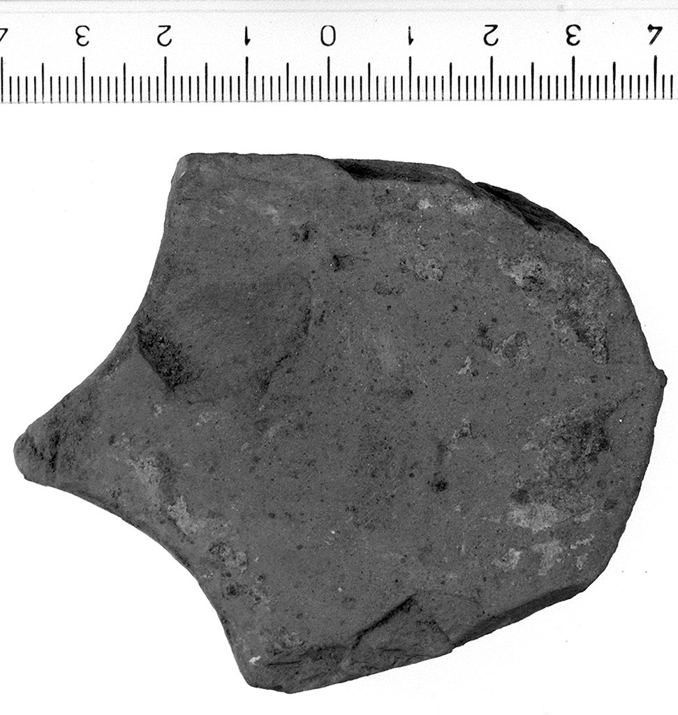 Forma a squama. Pertinente a rivestimento pavimentale. Superficie lisciata, con tracce di scialbatura biancastra (calce?). Impasto duro, compatto, con piccoli inclusi bruni