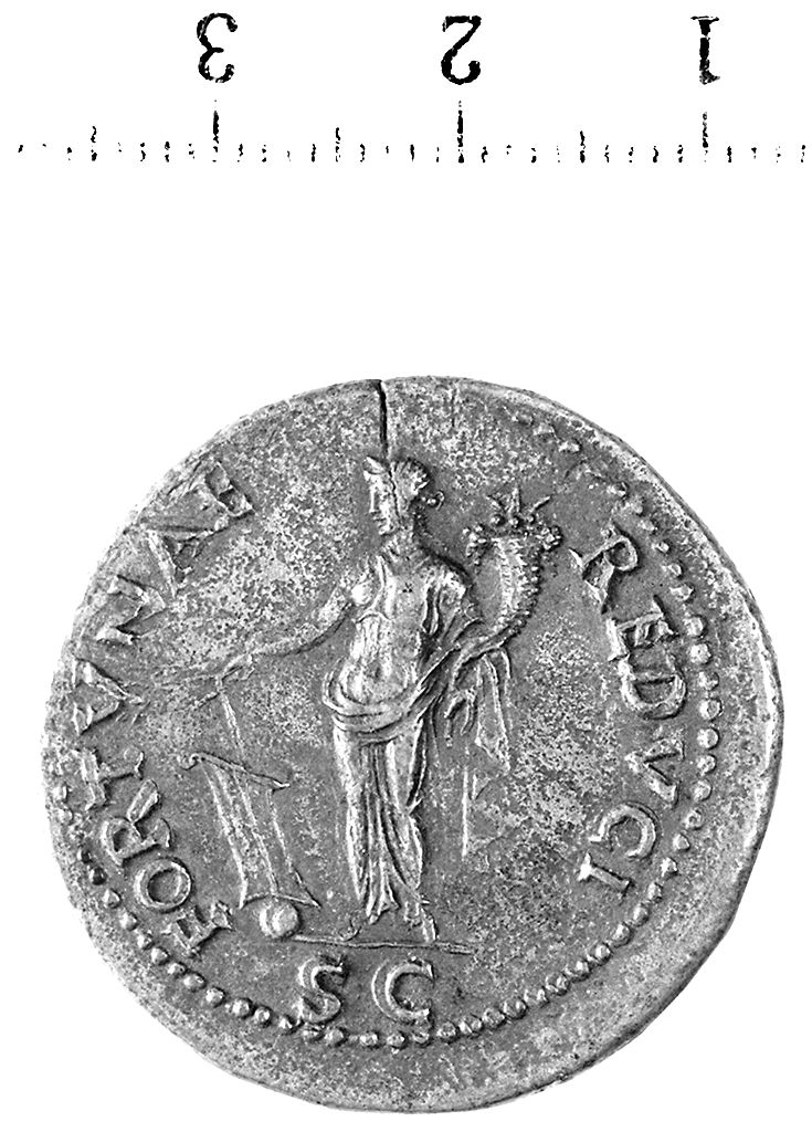 D/ Testa radiata di Vespasiano a d. R/ La Fortuna stante a s. con timone su globo e cornucopia