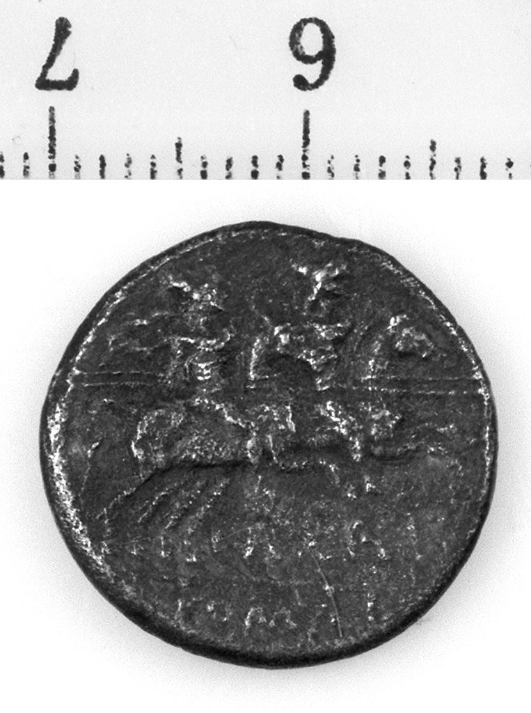 D/ Testa di Roma con elmo alato a d.; indicazione di valore: X. R/ I Dioscuri al galoppo verso d