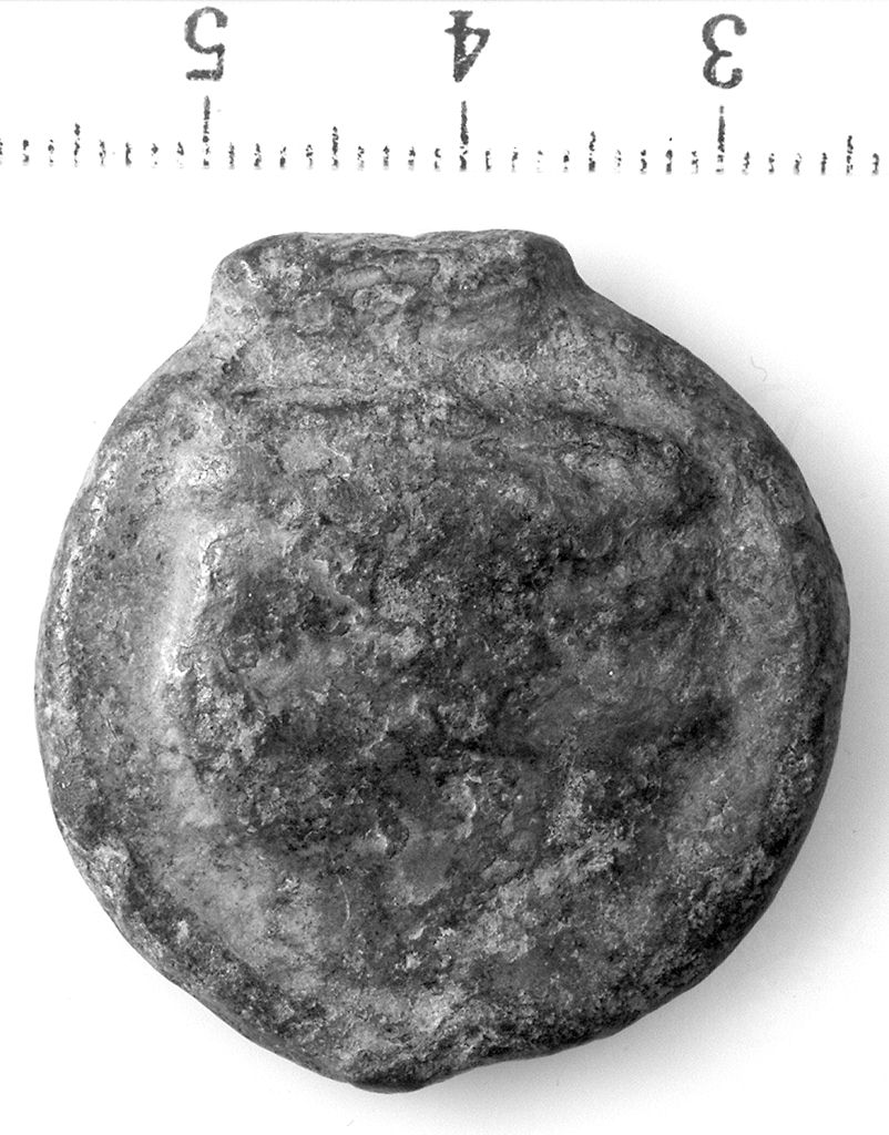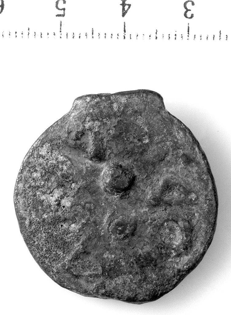 D/ Testa giovanile bifronte, imberbe con copricapo a punta. R/ Al centro 3 punti in rilievo