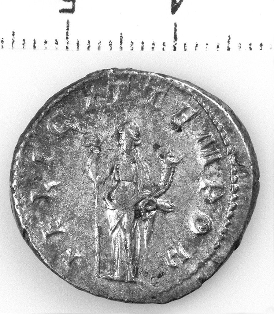 D/ Busto di Gordiano radiato, drappeggiato e corazzato, volto a d. R/ La Felicitas stante di fronte e volta a s. con lungo caduceo e cornucopia