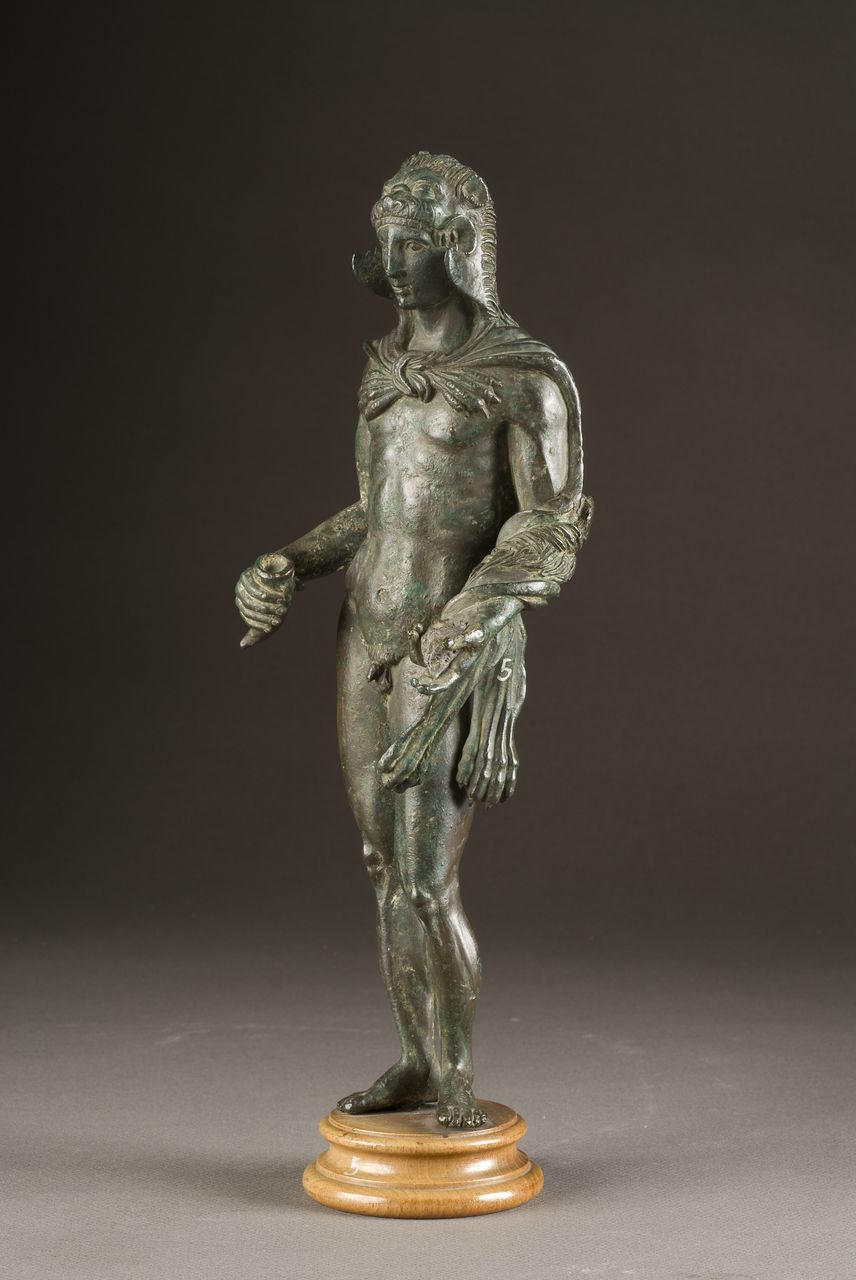 Statuetta di eroe mitico a tutto tondo su base di legno circolare modanata