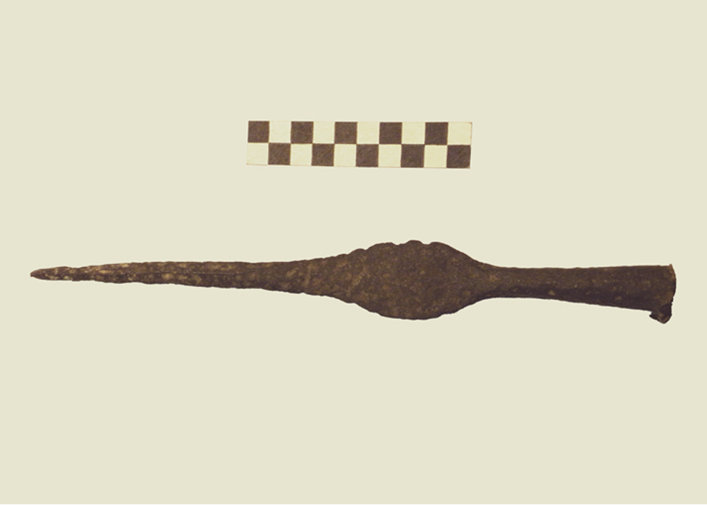 Punta di lancia in ferro con immanicatura a cannone. Lama a foglia d'edera molto allungata