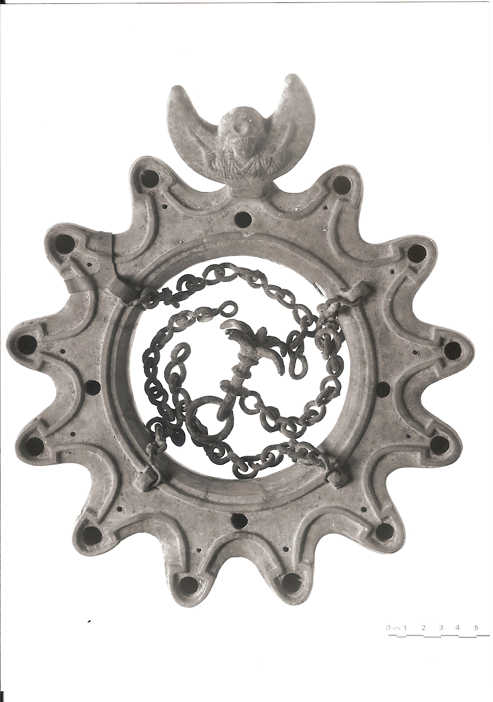 Lucerna polilicne con corpo rotondo vuoto, circondato da dodici corti becchi a canale aperto tipo Loeschcke X, K. La lucerna è provvista di quattro catenelle di bronzo pertinenti, inserite nelle apposite asole (una presenta un gancio moderno), che venivano sospese ad un gancio a quattro piedi ricurvi e perno centrale modanato, provvisto a sua volta di un anello per la sospensione. La presa lunata mostra il busto di una divinità femminile dal volto ovale e i lineamenti molto sommari. I capelli sono resi in ciocche arrotolate e ravviate verso la nuca, trattenute da un diadema sormontato dalla falce lunare. L'abbigliamento è costituito da un lungo chitone con scollatura a -V- e da un peplo fermato sulle spalle. Le braccia si presentano aderenti al corpo fino all'altezza del gomito, mentre gli avambracci sollevati in fuori mettono in mostra due fiaccole