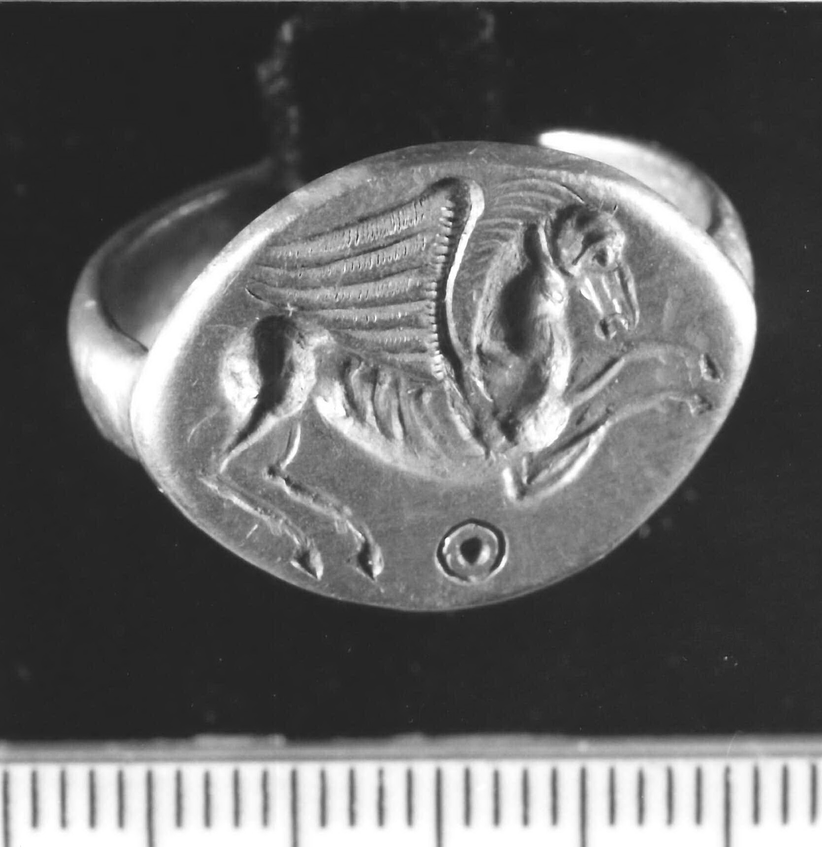 Anello d'oro massiccio con castone ovoide piatto su cui è figurato Pegaso galoppante verso destra. Le piume delle ali sono rese a brevi e fittili tratti e il costato con brevi e profonde incisioni. sotto la pancia del cavallo un tondino con puntolino centrale