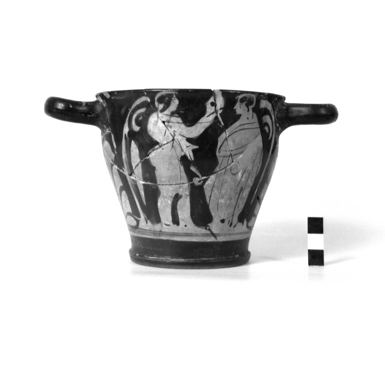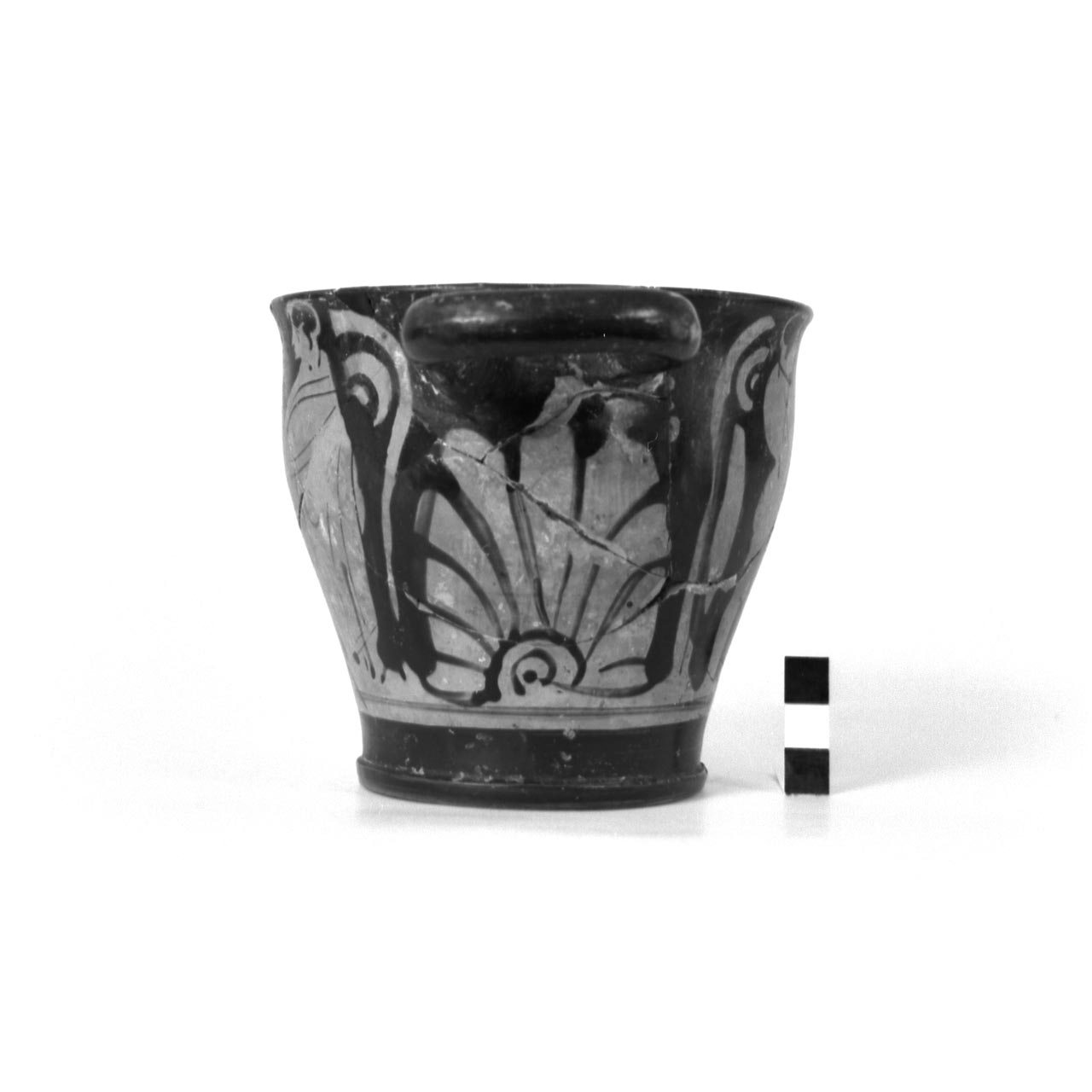 Ampia bocca con orlo indistinto, arrotondato; vasca troncoconica a profilo convesso; anse orizzontali a bastoncello, lievemente oblique, impostate poco sotto l' orlo; basso piede ad anello