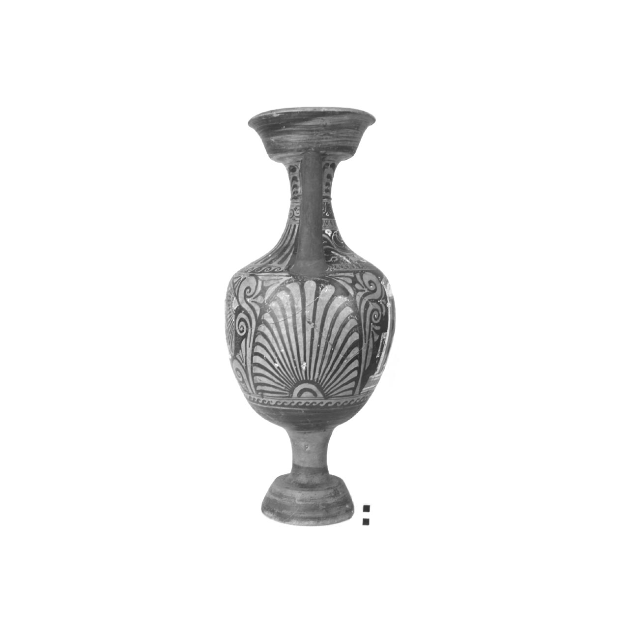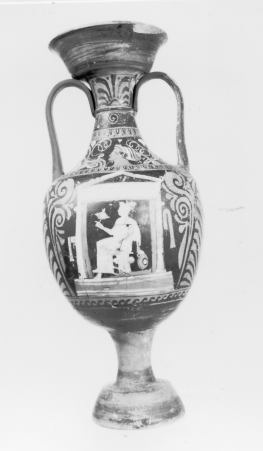 Bocca troncoconica rovescia, con labbro svasato ad orlo arrotondato; sottile collo cilindrico, lievemente strombato alla base, con anello a rilievo in corrispondenza dell' attacco delle anse; corpo ovoide; anse a nastro, impostate sul collo e sulla spalla; stelo cilindrico alto e sottile, su piede ad anello troncoconico. Particolari delle figure sovraddipinti in bianco e giallo