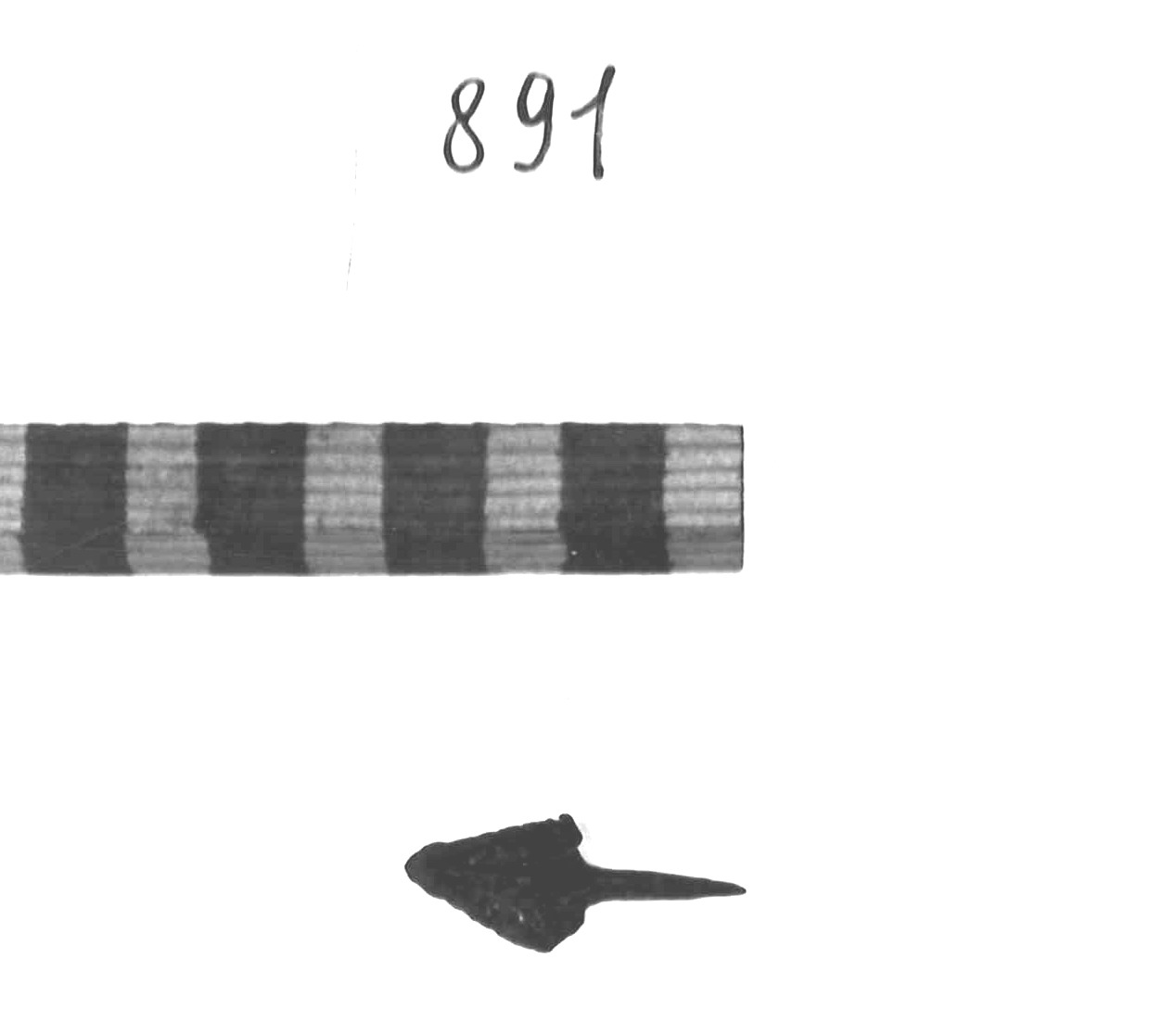 Lama triangolare, base che rientra ad angolo; costolatura mediana longitudinale che continua a formare peduncolo a sezione ovoidale